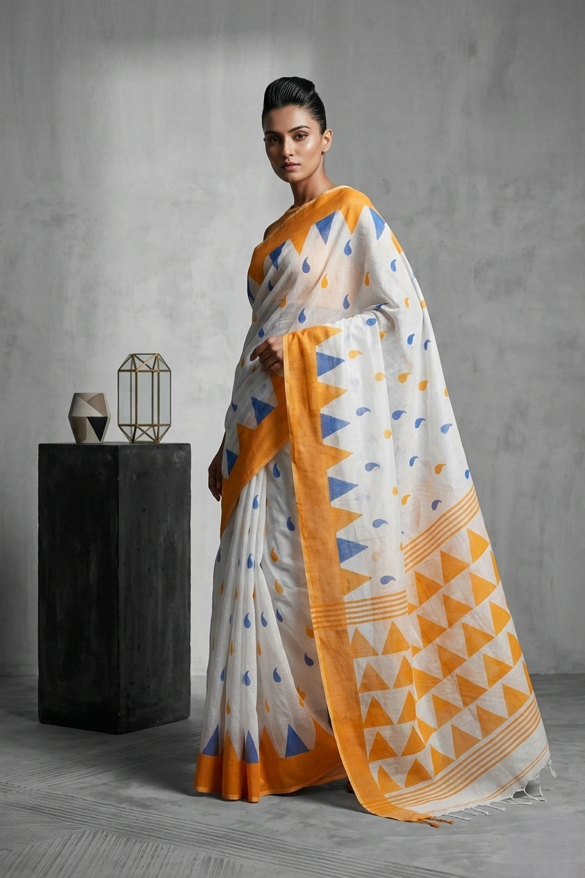 Abstract Printed Cotton Silk Saree with Yellow Border is a festive cotton silk saree with abstract prints on its entire body. The saree has yellow temple-printed borders on both sides. The saree comes with a running blouse piece. It is a perfect fit for festivals and weddings.