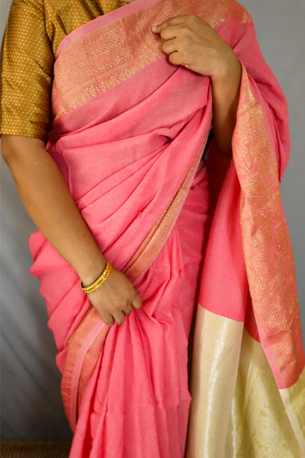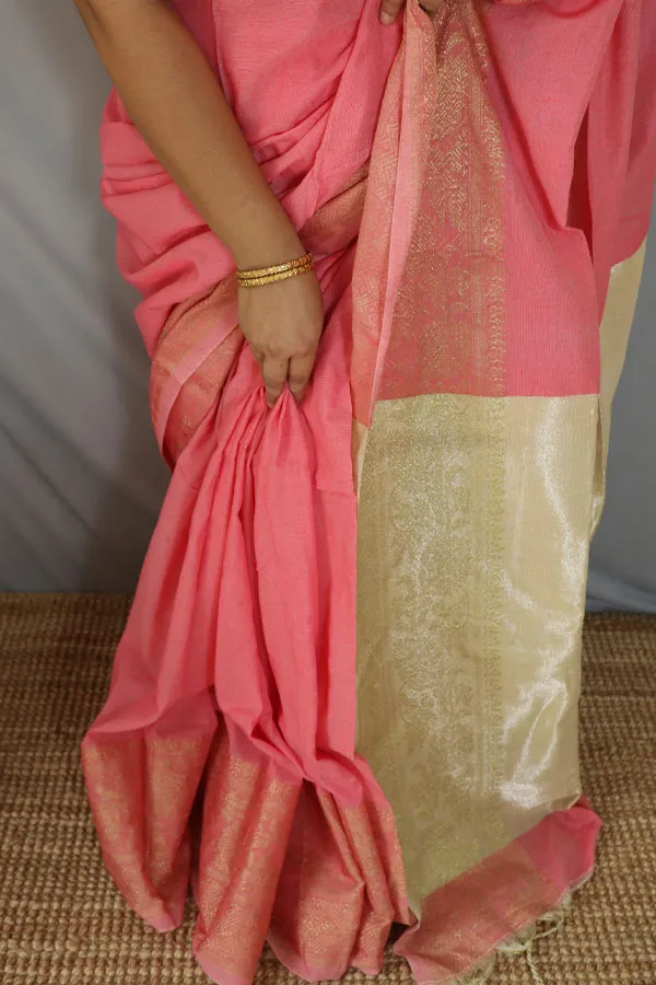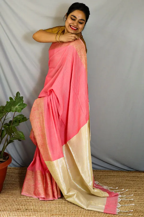 Baby Pink Cotton Saree with Broad Zari Border is a festive cotton saree with a baby pink coloured plain body. The saree has a beautiful contrasting golden zari woven border and palla. The saree comes with a running blouse piece. It is a perfect fit for festivals and weddings.