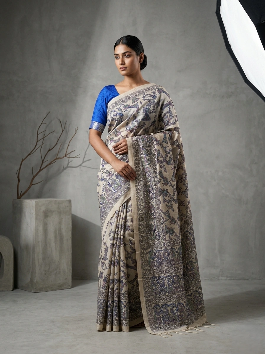 Beige Madhubani Printed Semi Tussar Ghicha Silk Saree