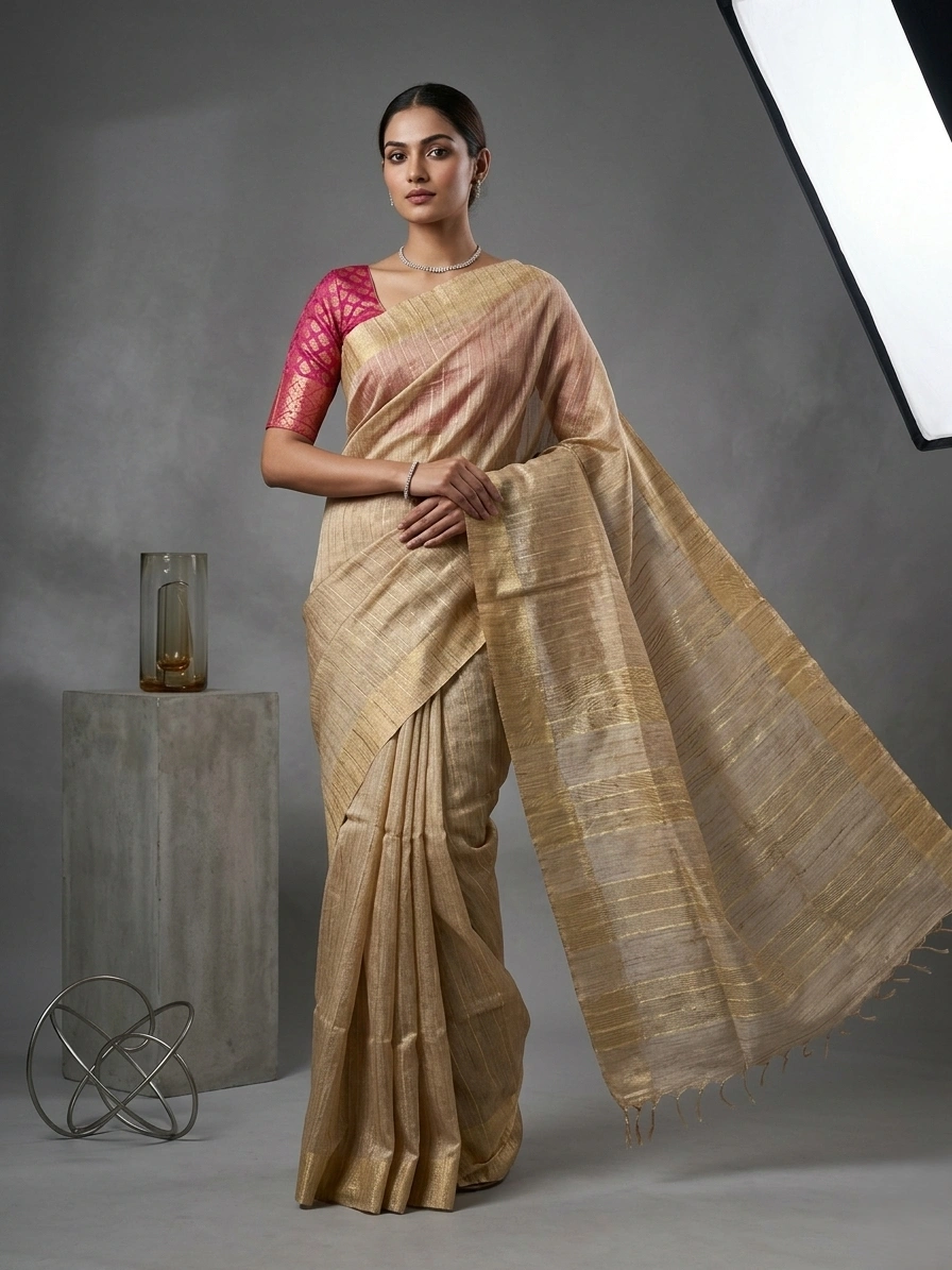 Beige Semi Tussar Silk Saree is a plain semi-tussar silk saree with broad zari borders. The saree is made of rich fabric and comes with a running blouse piece.