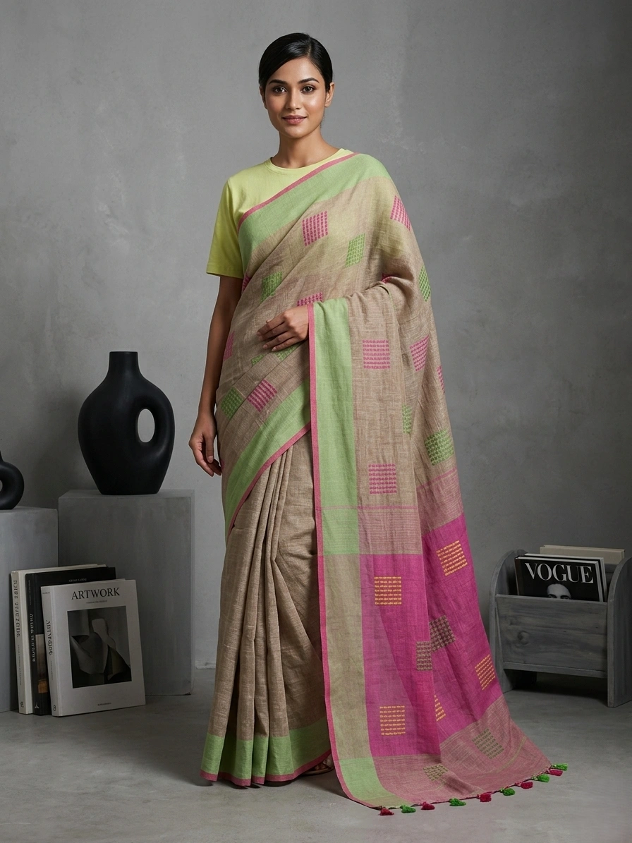 Beige Soft Cotton Linen Saree with Box Motifs is a cotton linen saree with thread-woven box motifs all over the body. The saree comes with contrast borders and the aanchal of the saree has tasselled ends. The saree has a running blouse piece.