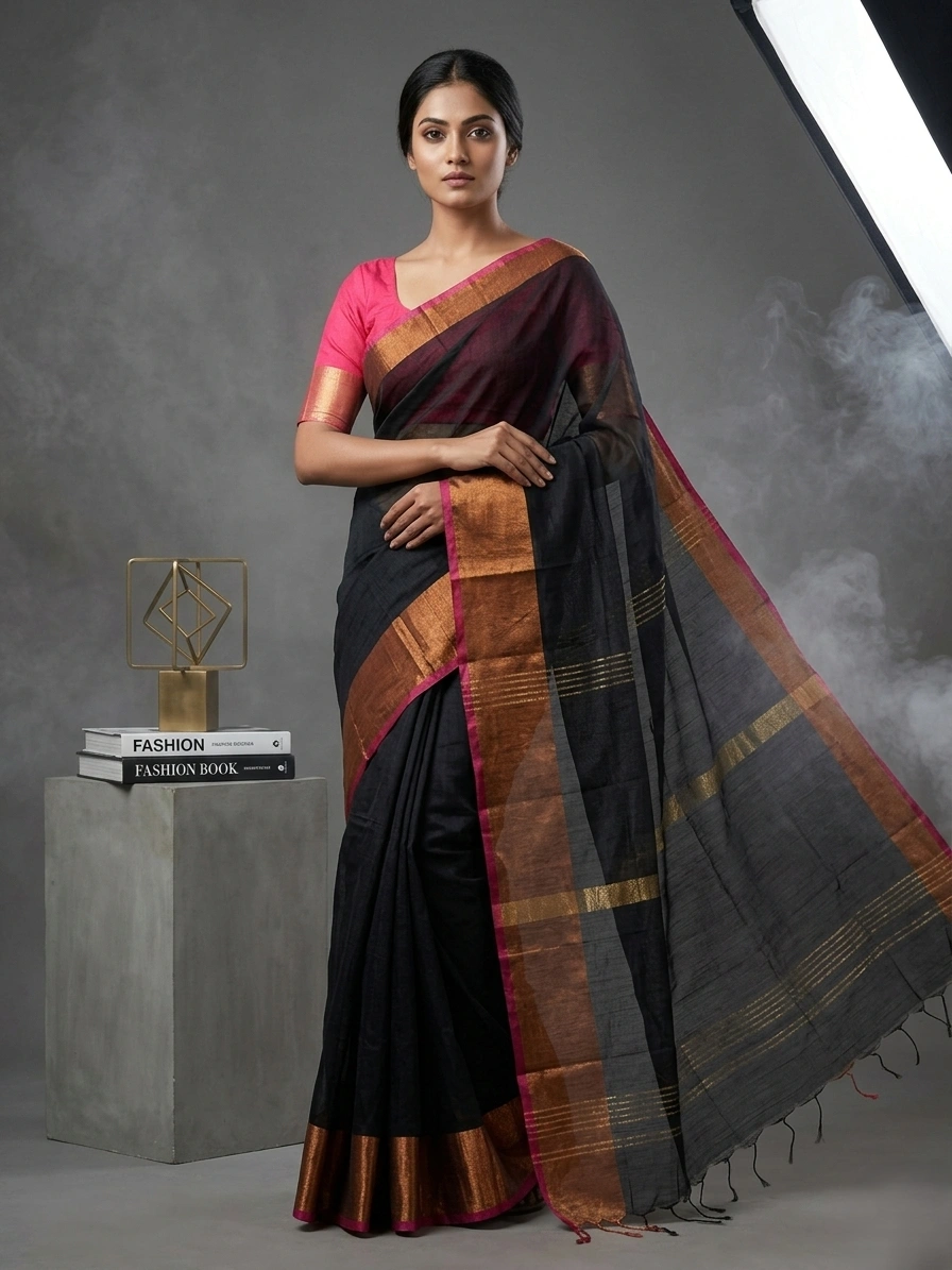 Black Plain Cotton Silk Saree with Copper Zari Border is a festive cotton silk saree with a plain body in a solid colour. The saree has a broad golden border on one side and a narrow golden border on the other side. The saree comes with a running blouse piece. It is a perfect fit for festivals and weddings.