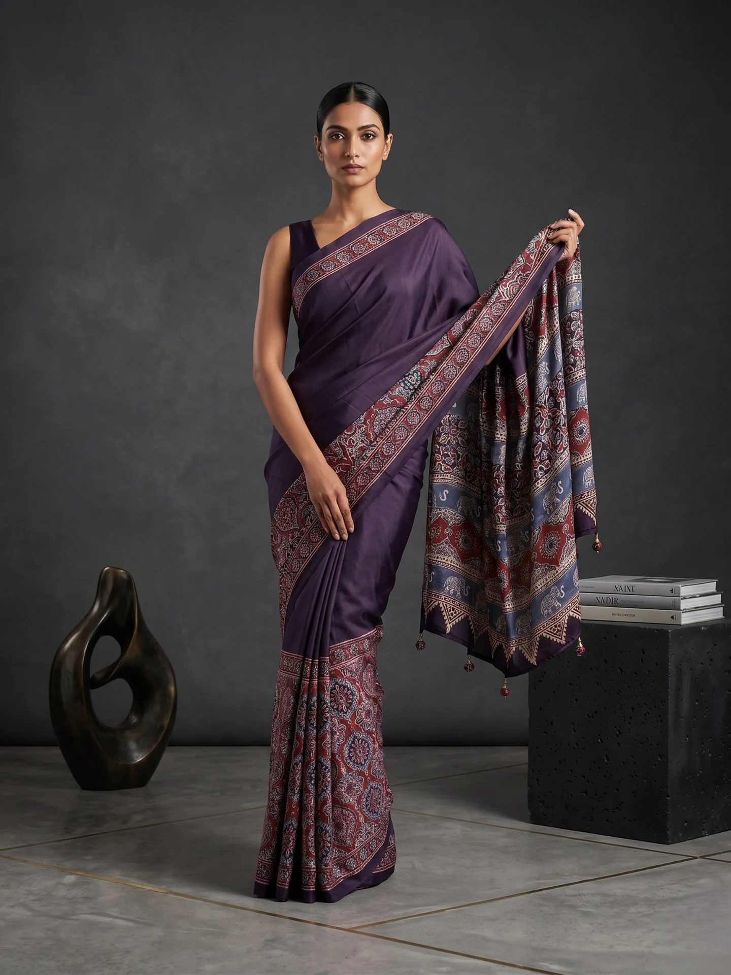 Black Semi Modal Silk Saree with Ajrakh Border
