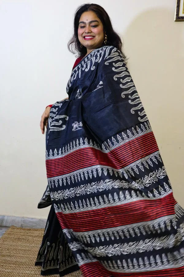 Elevate your elegance with this silk replica saree, adorned with warrior prints on the entire body. A beautifully fern-printed border enhances its charm, making it a perfect blend of tradition and contemporary style. The saree comes with a running blouse piece (last picture).