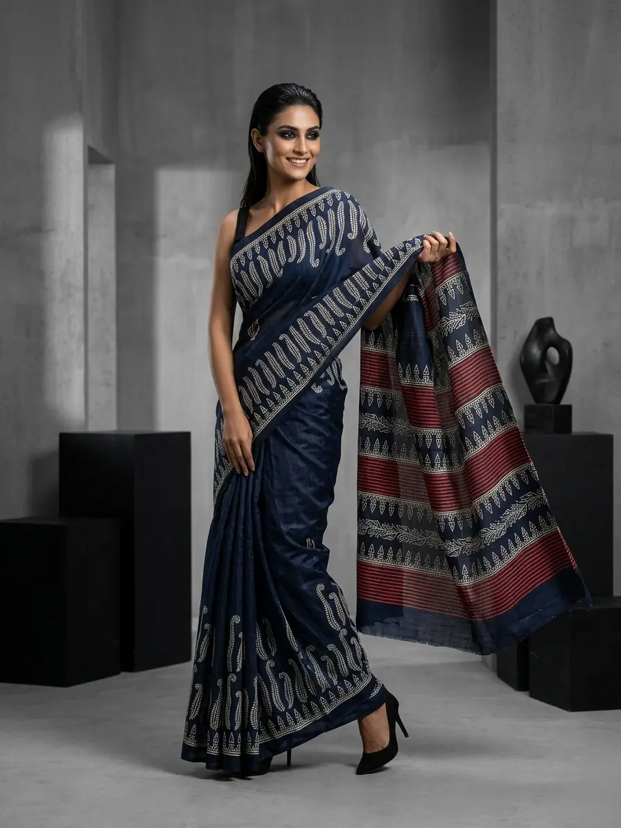 Elevate your elegance with this silk replica saree, adorned with warrior prints on the entire body. A beautifully fern-printed border enhances its charm, making it a perfect blend of tradition and contemporary style. The saree comes with a running blouse piece (last picture).