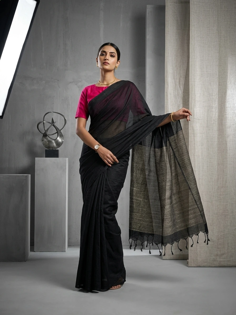 This is a solid-coloured soft cotton saree with a brown ghicha aanchal. The aanchal of the saree has a tasselled end and comes with a running blouse piece. This one is going to be a perfect daily and work wear and can even be worn to any family gatherings or a day out.