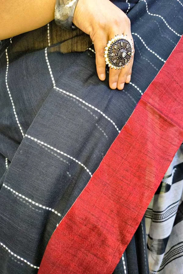 Black Thread Woven Soft Cotton Saree with Red Border is a soft cotton saree with thread-woven horizontal chains done all over the body and comes with a contrast border. The aanchal of the saree has triangle thread motifs. The saree comes with a running blouse piece.