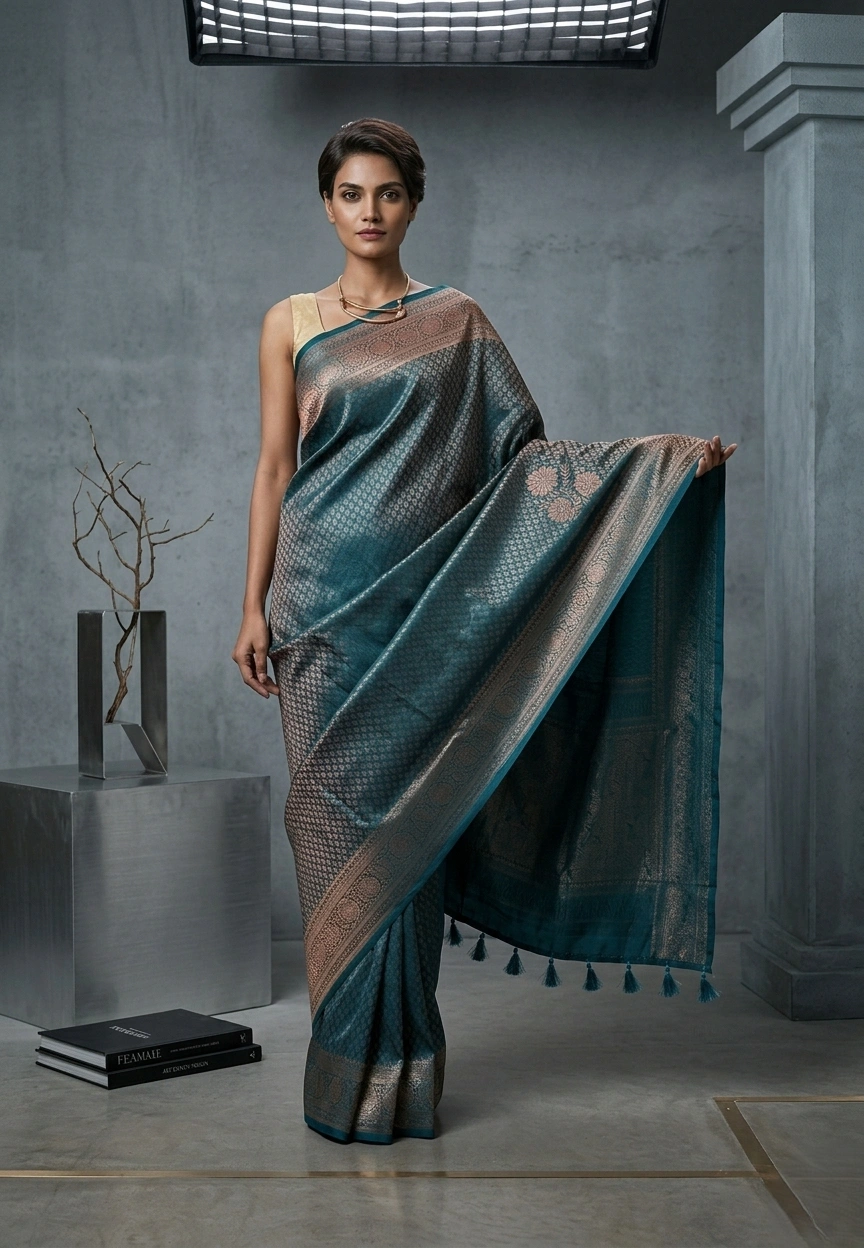Blue Art Silk Saree with Full Body Copper Zari Motifs