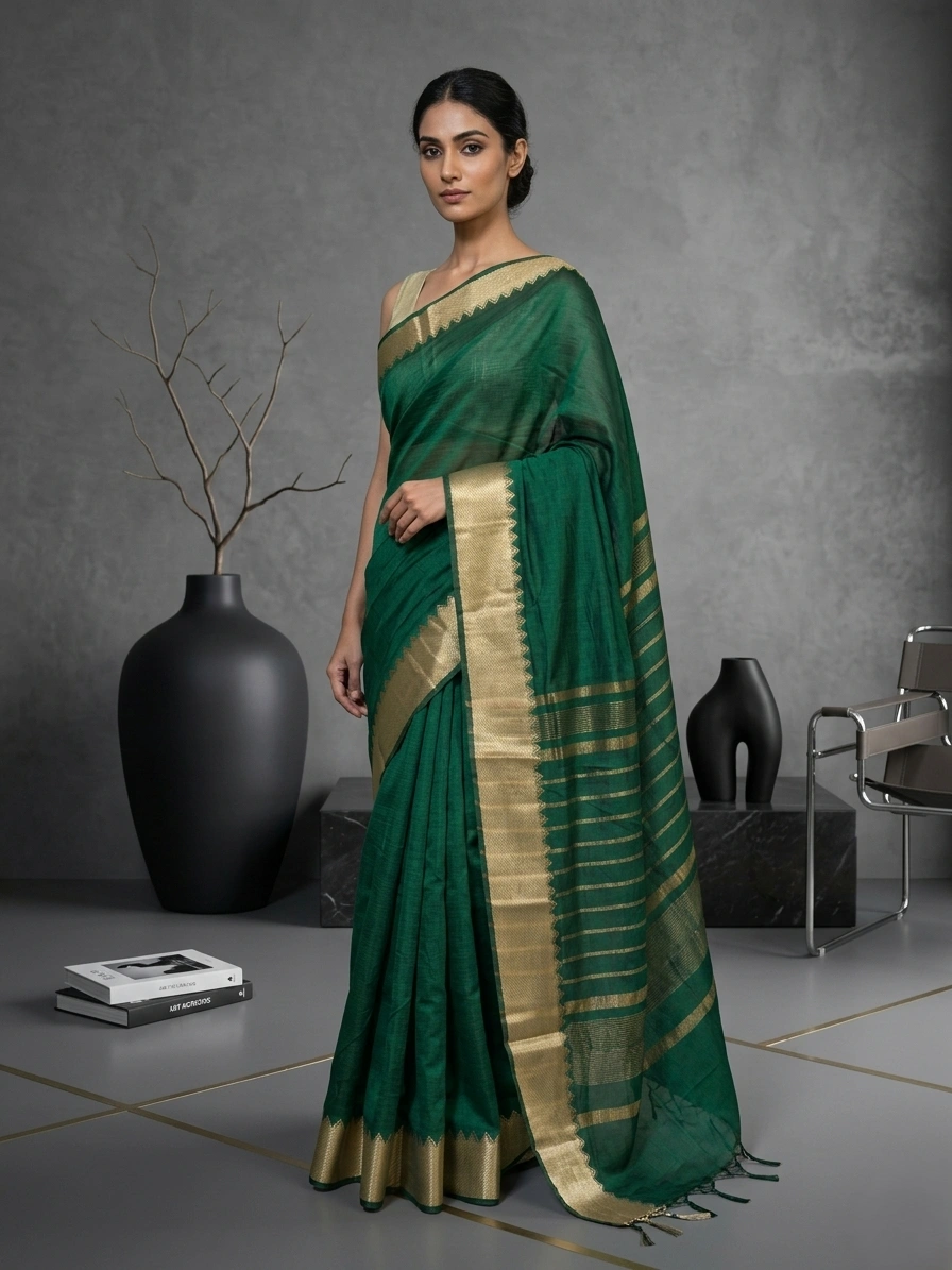 Green Cotton Silk Saree with Golden Temple Border is a Mangalgiri cotton silk saree with a plain body and zari woven temple borders.