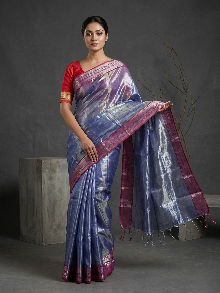 Blue Raaga Tissue Saree with Contrast Border is a tissue saree with contrast thread woven borders. The saree has a plain body with dual toned highlights and comes with a blouse piece.