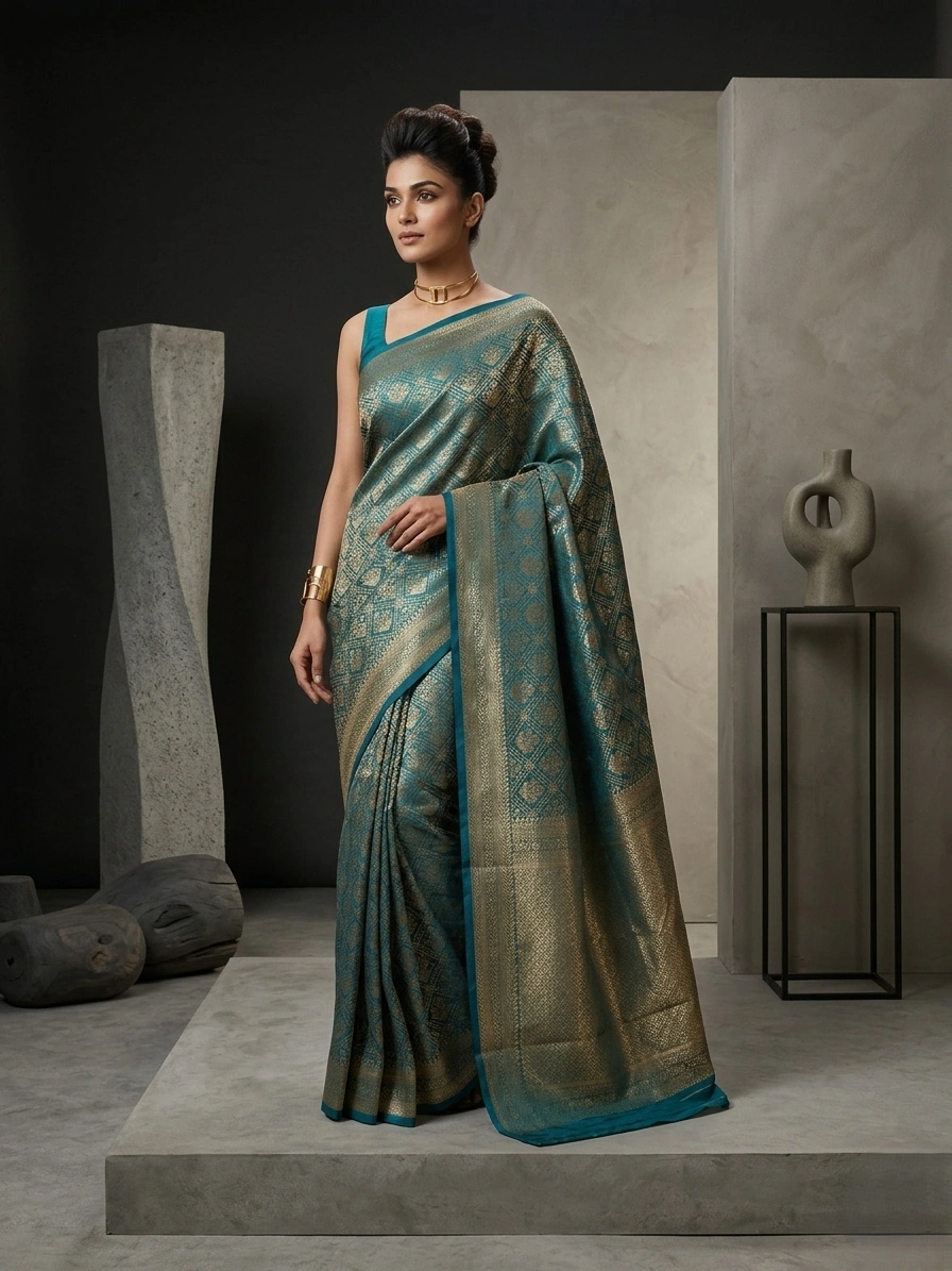 The saree’s texture and rich tone make it ideal wear for events, parties, and weddings.