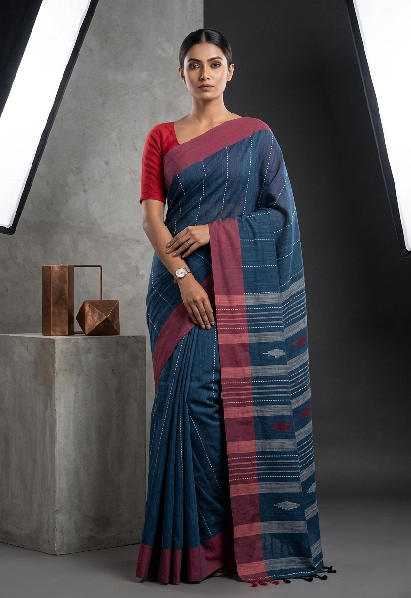 Blue Thread Woven Soft Cotton Saree with Red Border is a soft cotton saree with thread-woven horizontal chains done all over the body and comes with a contrast border. The aanchal of the saree has triangle thread motifs. The saree comes with a running blouse piece.