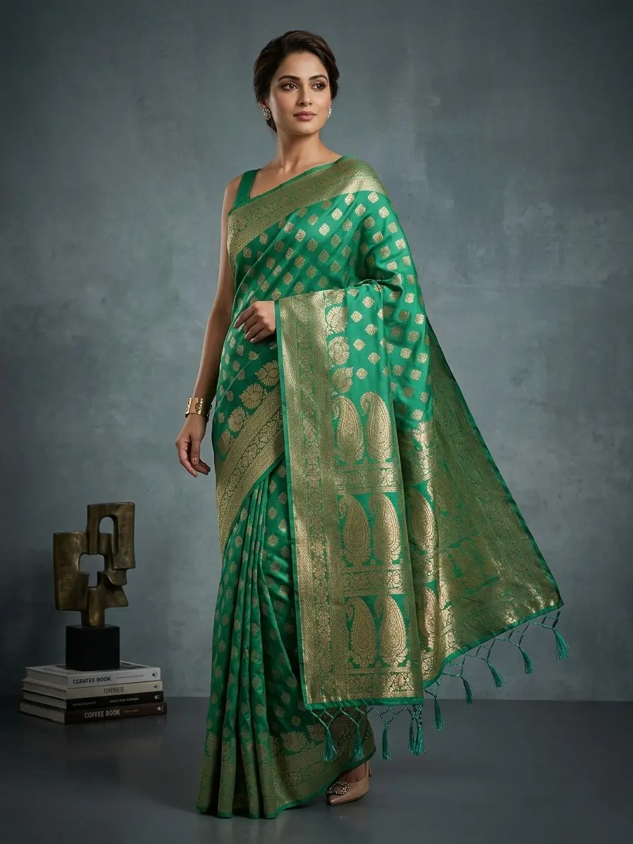 Green Semi Banarasi Silk Saree in Silver Zari