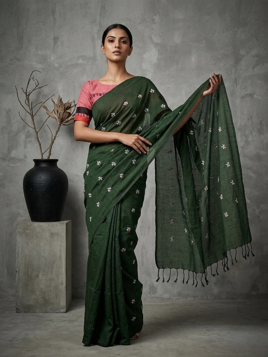 Green Soft Cotton Saree with Parijat Motifs