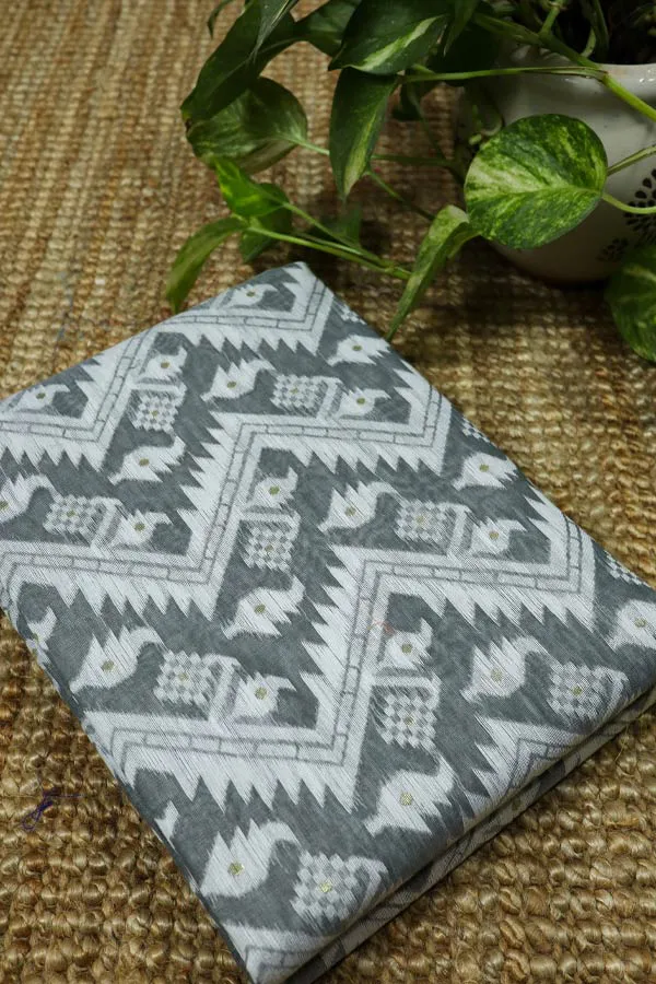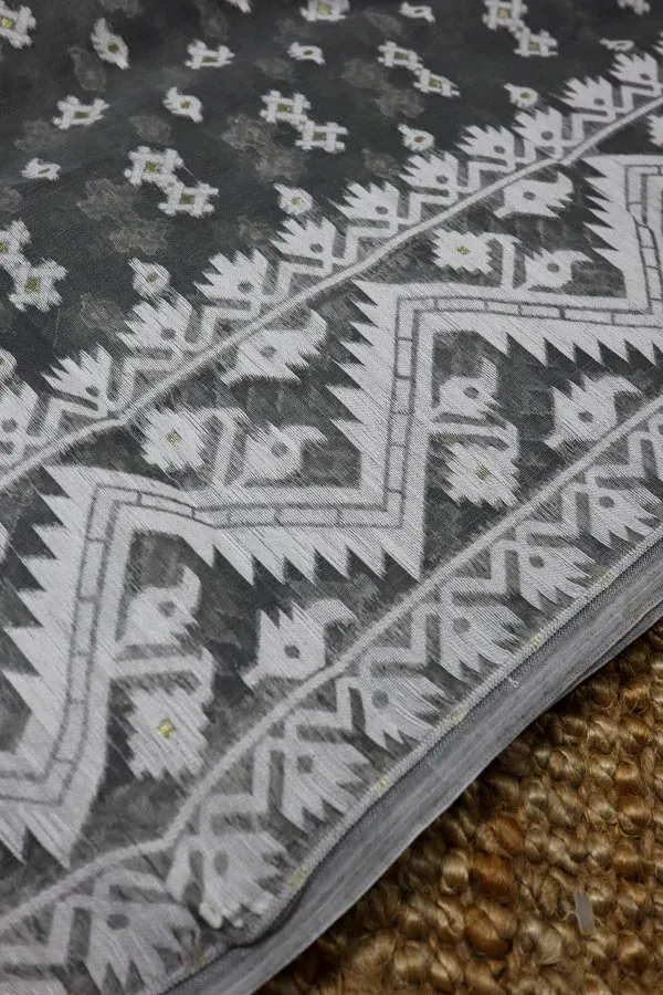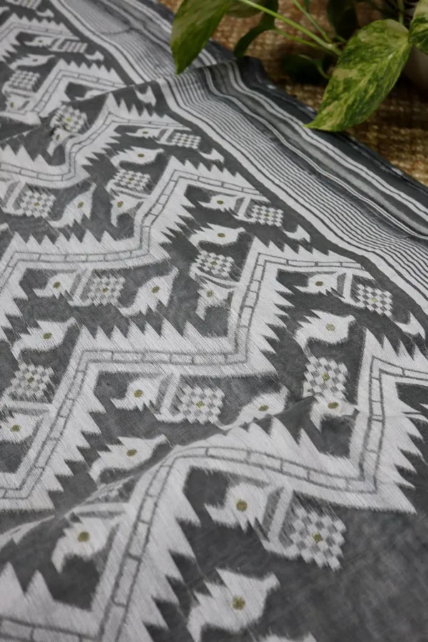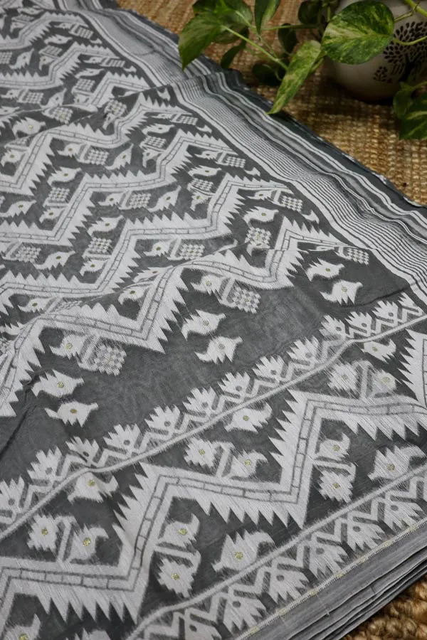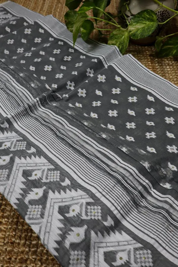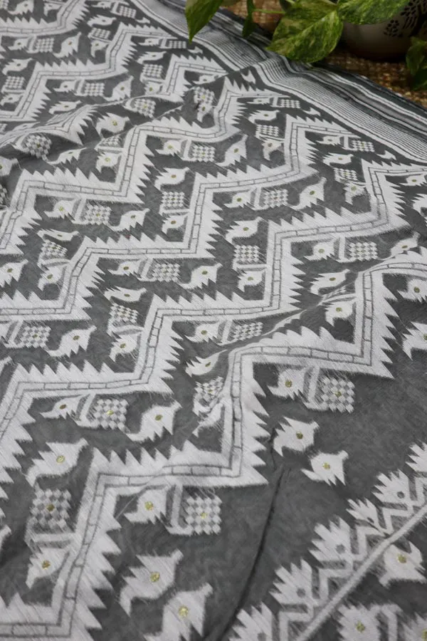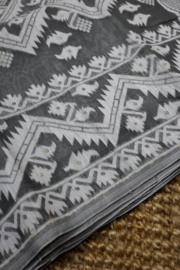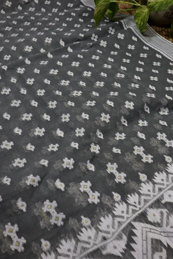 Grey Jamdani Saree is a Jamdani saree with a grey coloured body and white Jamdani motifs done all over it. Jamdani sarees do not come with a blouse piece. It is a perfect fit for day festivals and work.