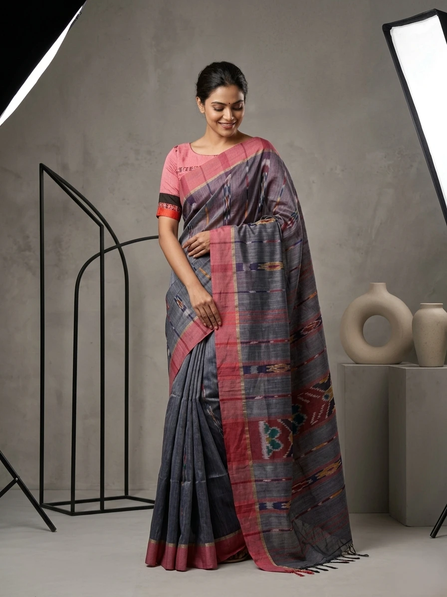 Grey Sambalpuri Ikat Printed Soft Cotton Saree