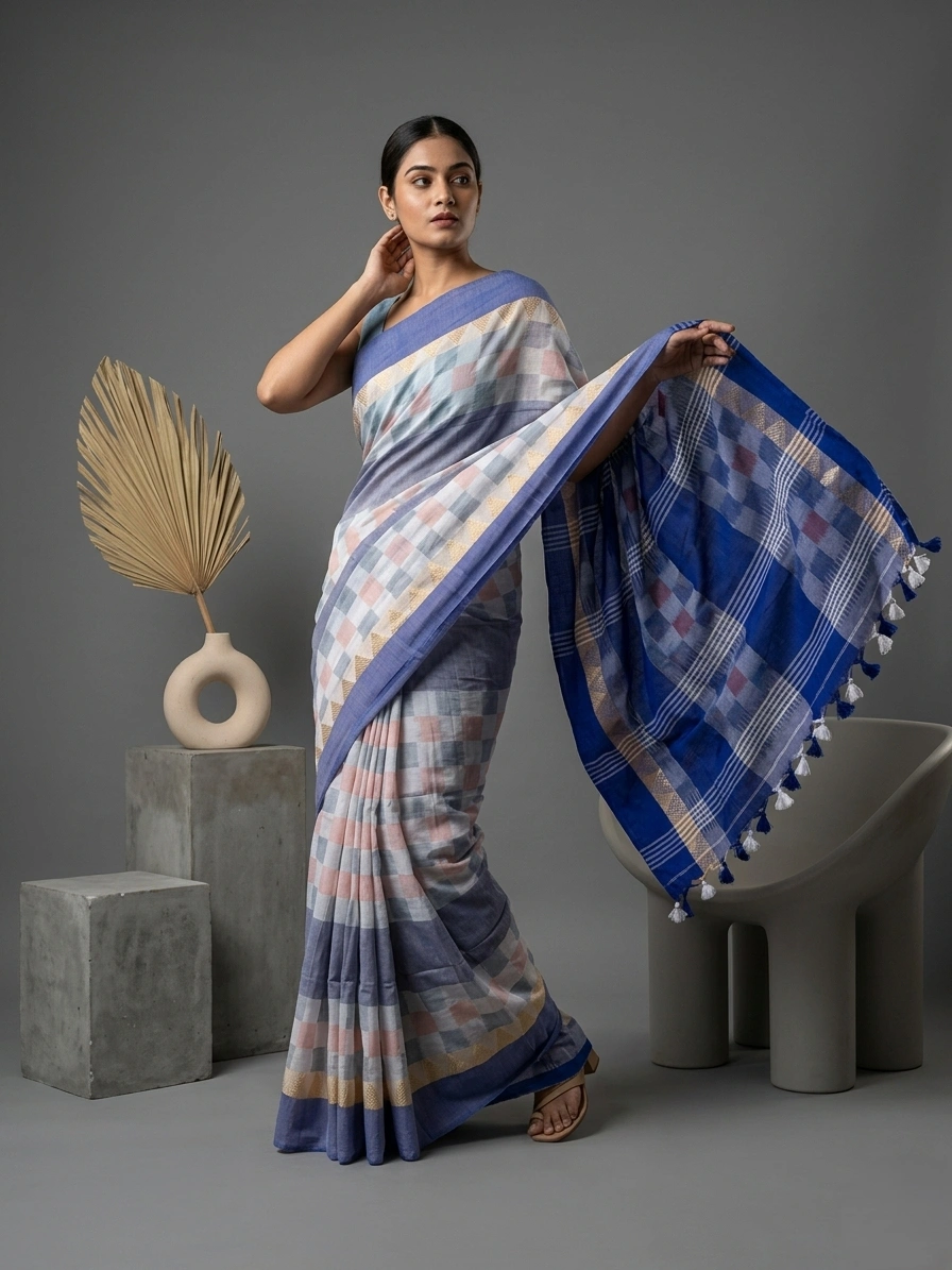 is a cotton saree with Sambalpuri motifs printed all over the body. Also, the saree comes with a thread-woven temple border and tasselled ends. The saree comes with a running blouse piece. It can be worn to the office or any other informal gathering.