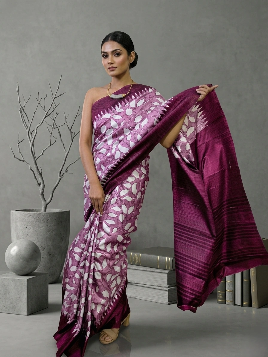 Elevate your elegance with this silk replica saree, adorned with leaf vine prints on the entire body. A beautifully contrasting temple-printed border enhances its charm, making it a perfect blend of tradition and contemporary style. The saree comes with a running blouse piece.