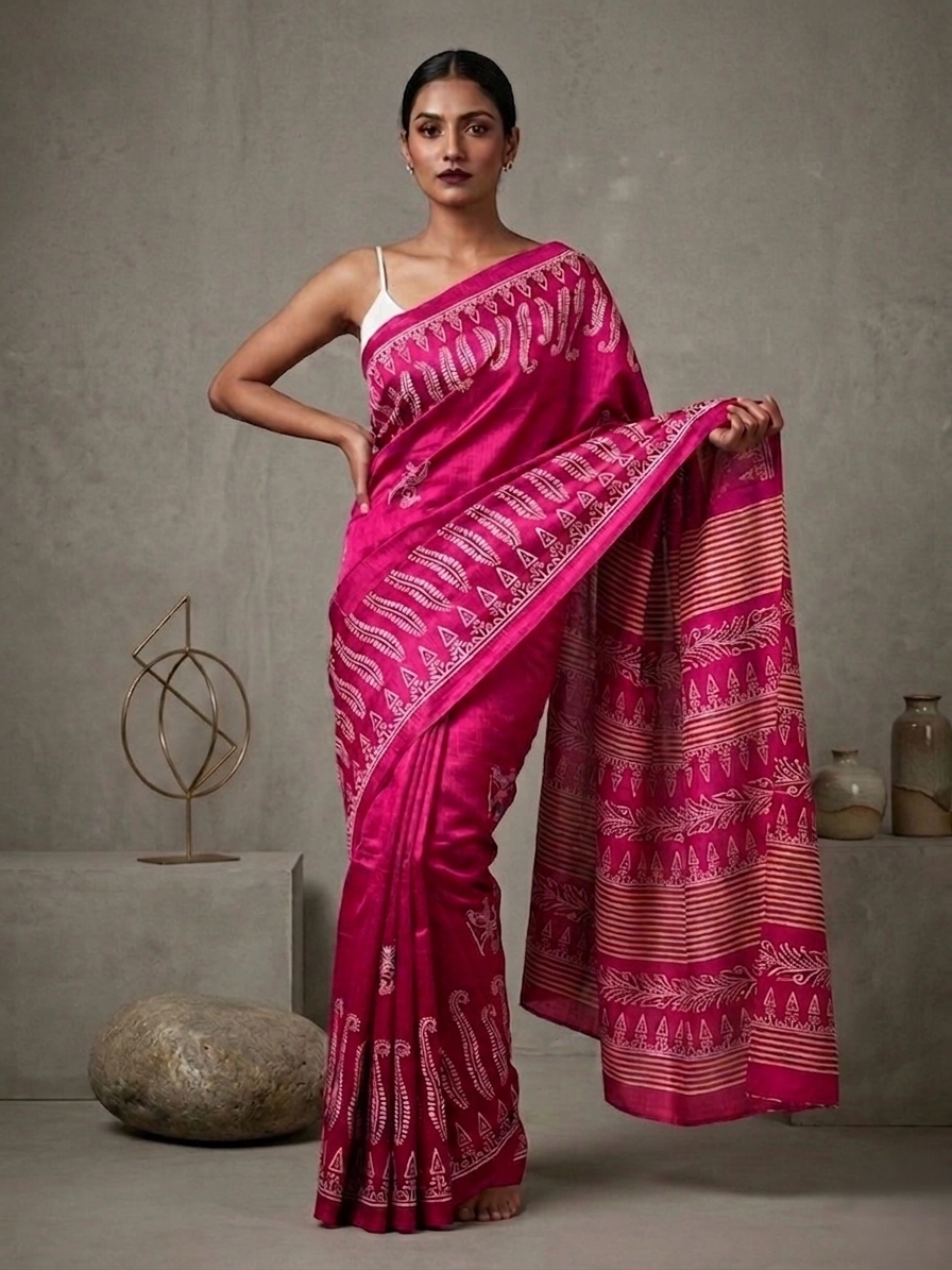 Magenta Semi Silk Saree with Fern Printed Border