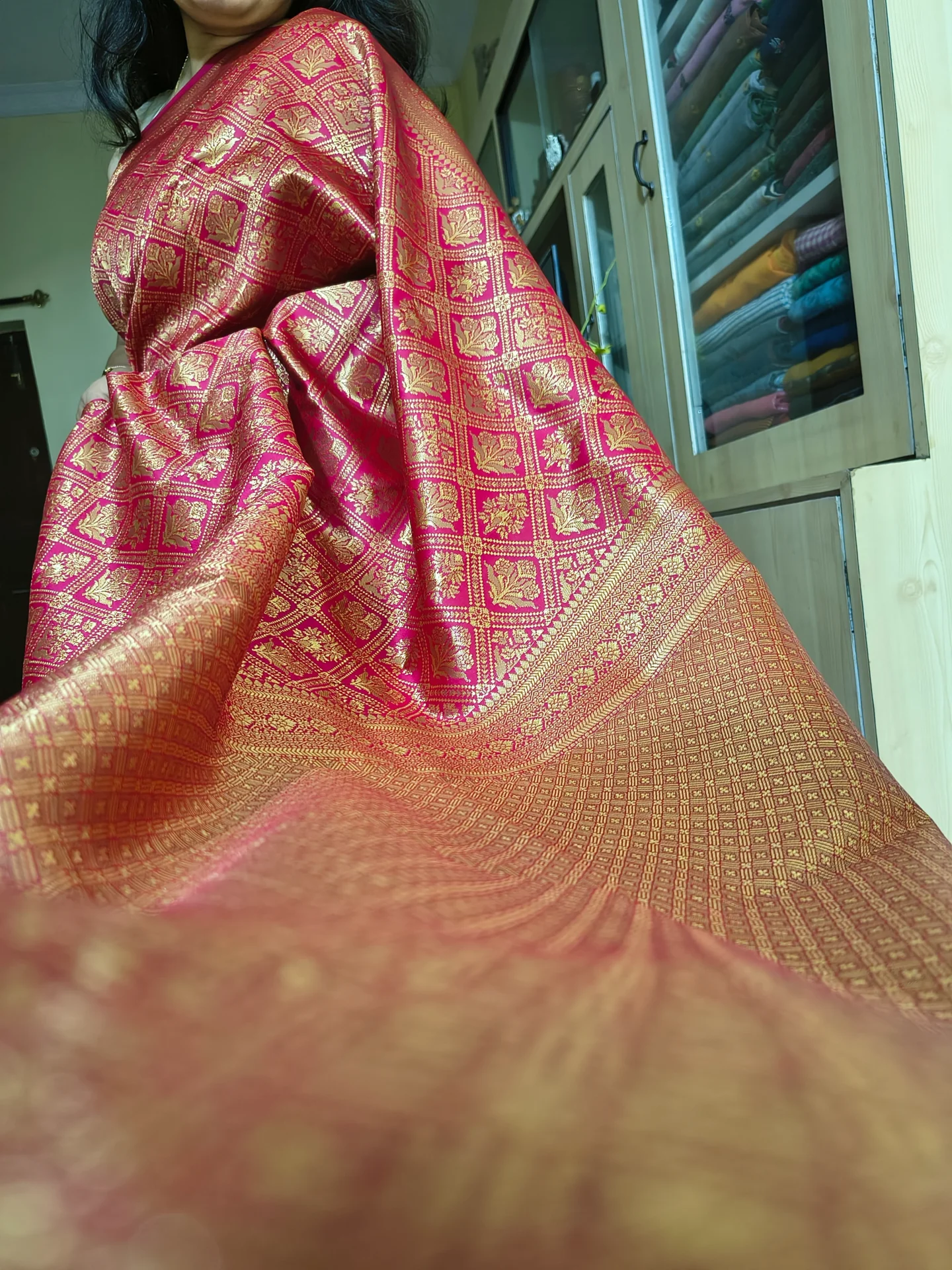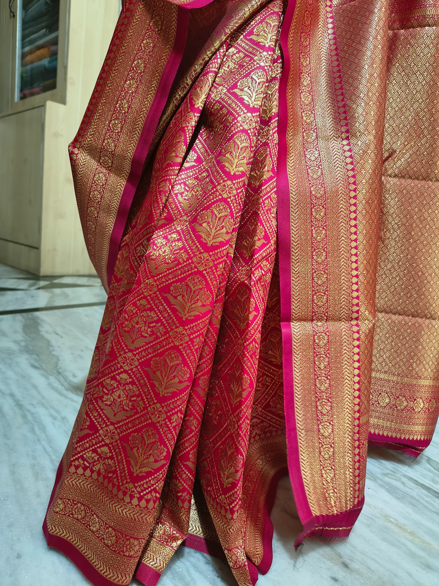 Maroon Semi Banarasi Silk Saree is an art silk saree with full body Banarasi zari woven work done. The saree has a rich and soft fabric and comes with a running blouse piece.