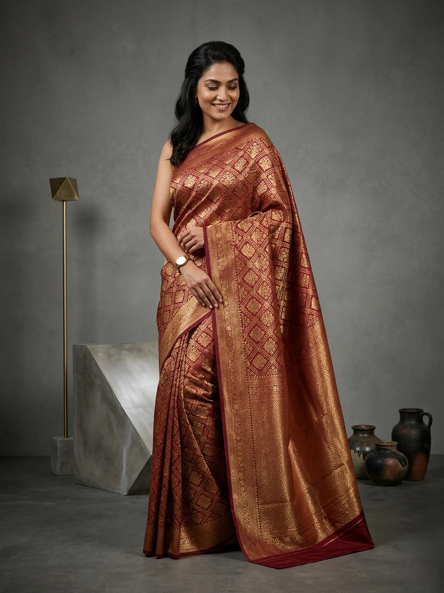 The saree’s texture and rich tone make it ideal wear for events, parties, and weddings.