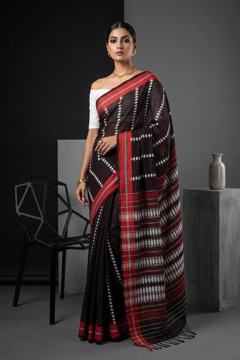 Black Thread Woven Soft Cotton Saree with Red Border