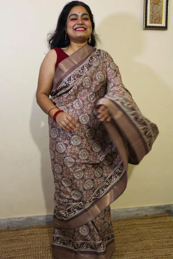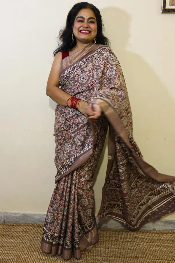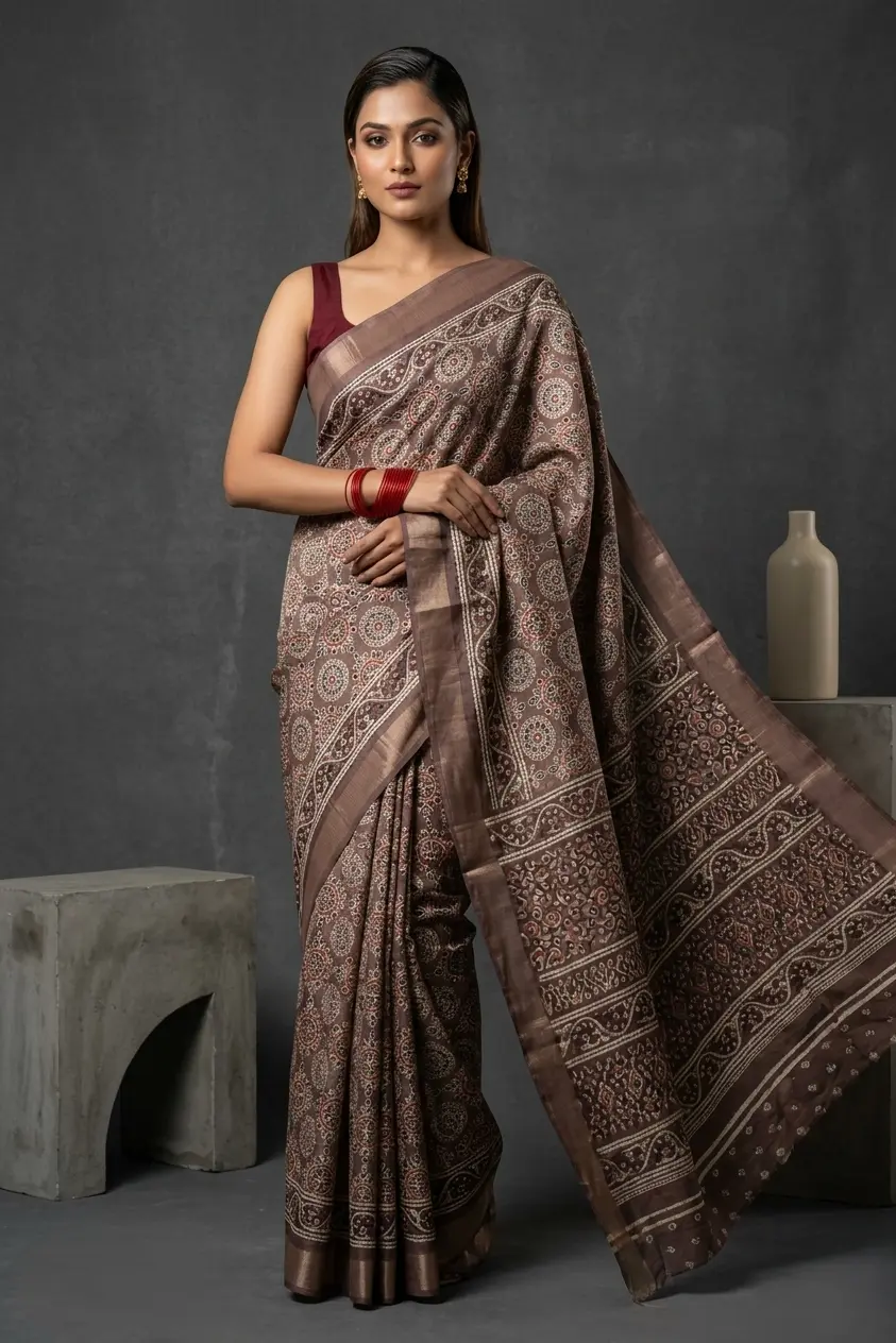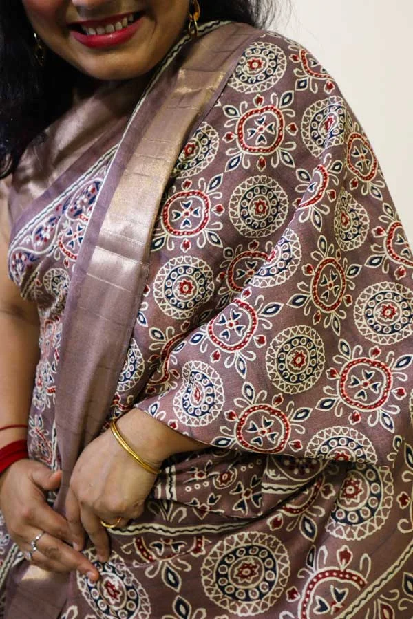 Ajrakh Printed Art Silk Saree is a printed silk saree with narrow golden zari woven borders. The entire body of the saree has Ajrakh print on it. It also comes with a blouse piece.