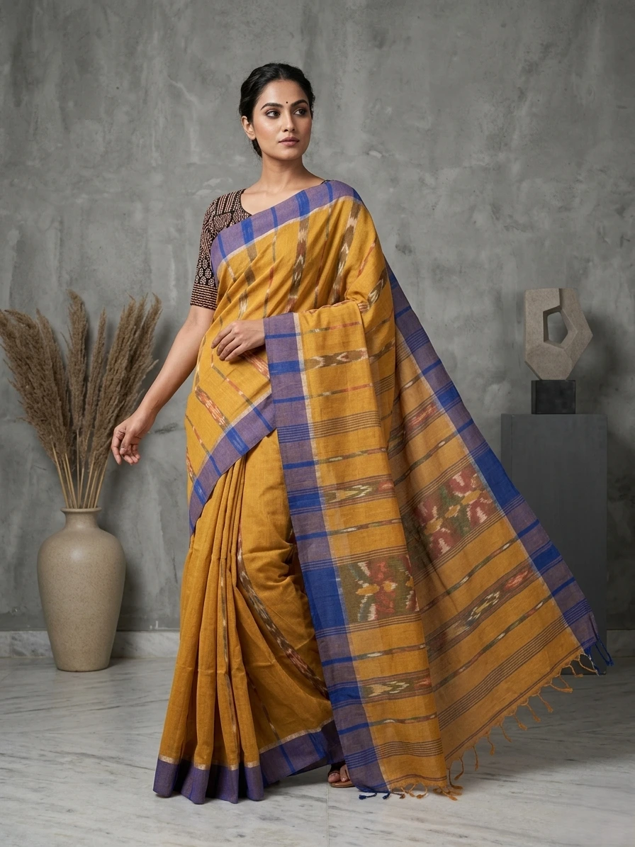 Mustard Sambalpuri Ikat Printed Soft Cotton Saree