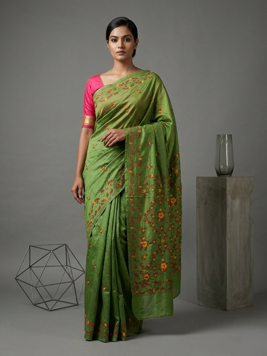 Olive Green Art Silk Saree with Yellow and Red Shantiniketan Kantha Embroideries