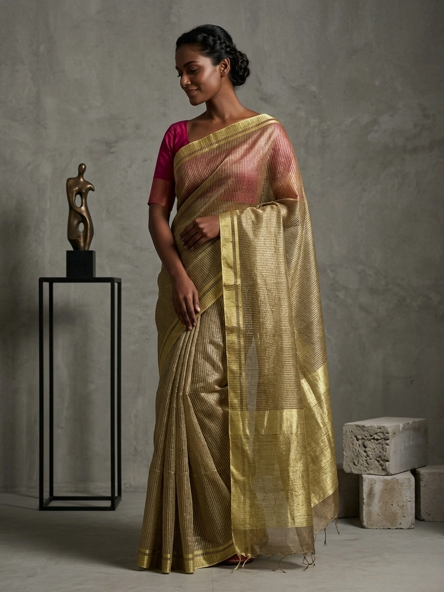 Olive Green Semi Ghicha Silk Saree is a semi-Ghicha silk saree with broad zari borders. The saree is made of rich fabric and comes with a running blouse piece.