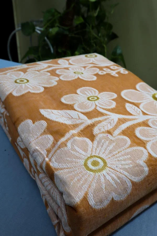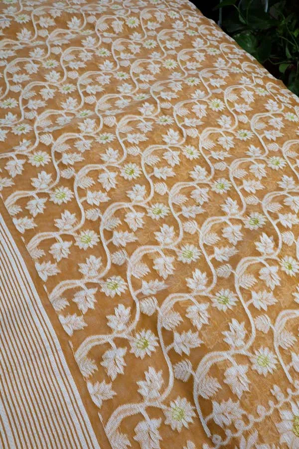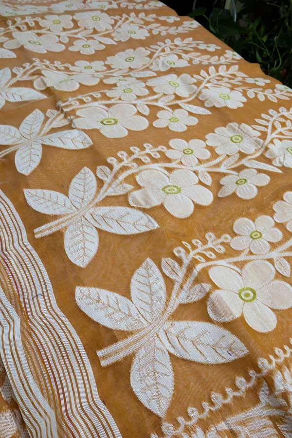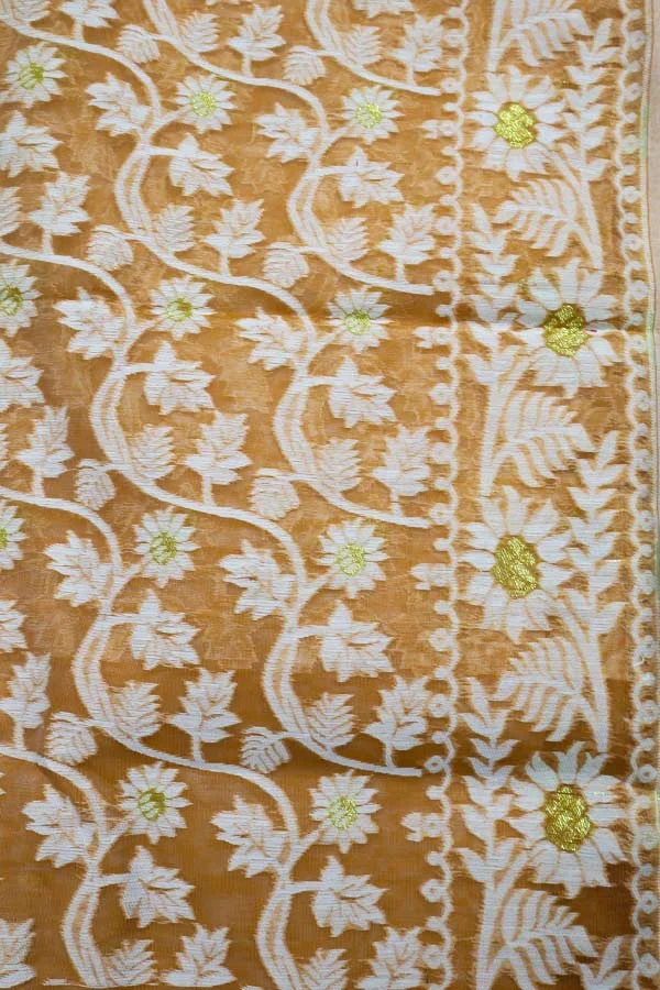 Orange Dhakai Jamdani Saree is a Jamdani saree with a pastel orange coloured body and white Jamdani motifs done all over it. Jamdani sarees do not come with a blouse piece. It is a perfect fit for day festivals and work.