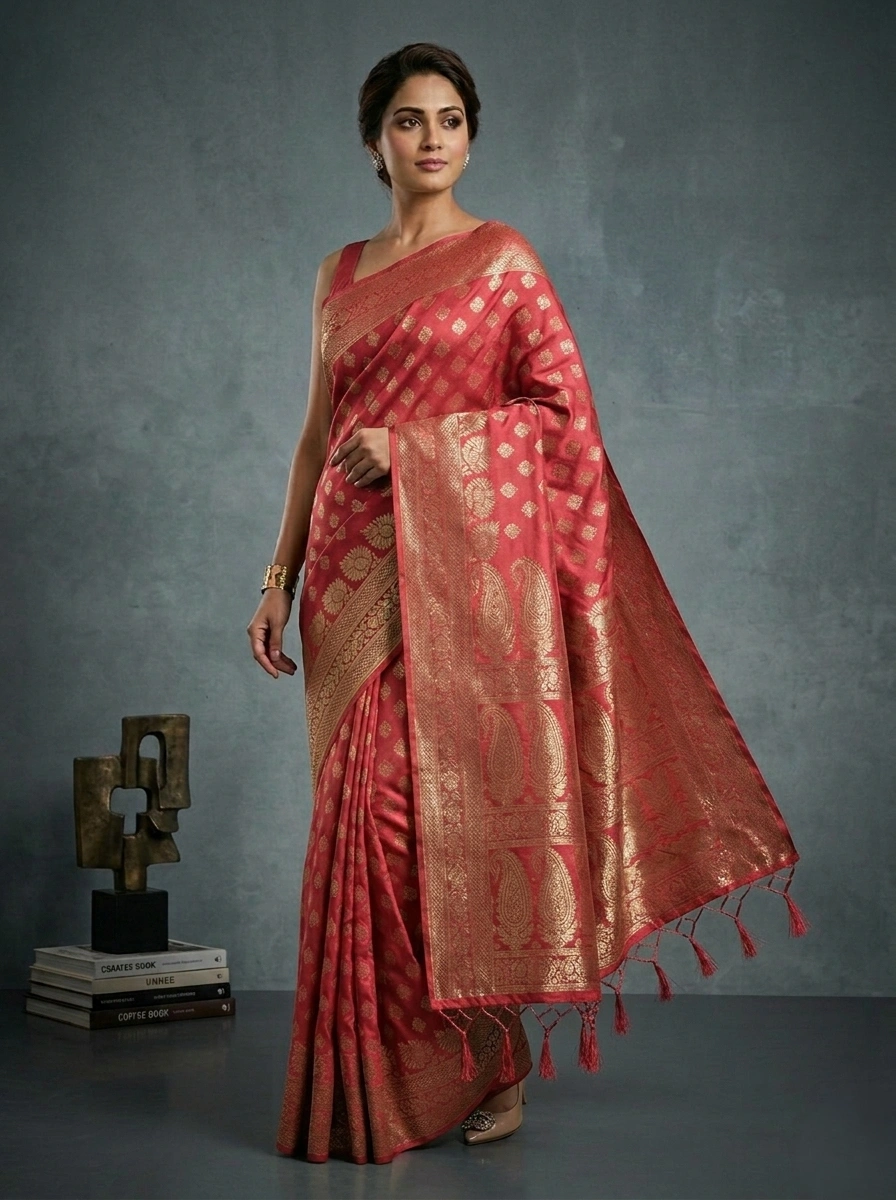 The saree’s texture and rich tone make it ideal wear for events, parties, and weddings.