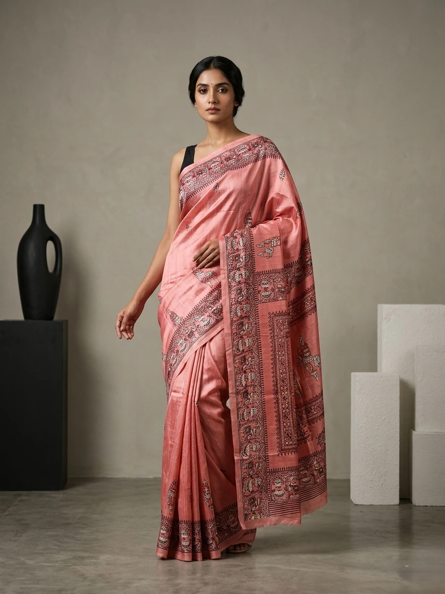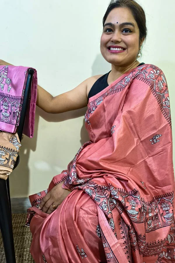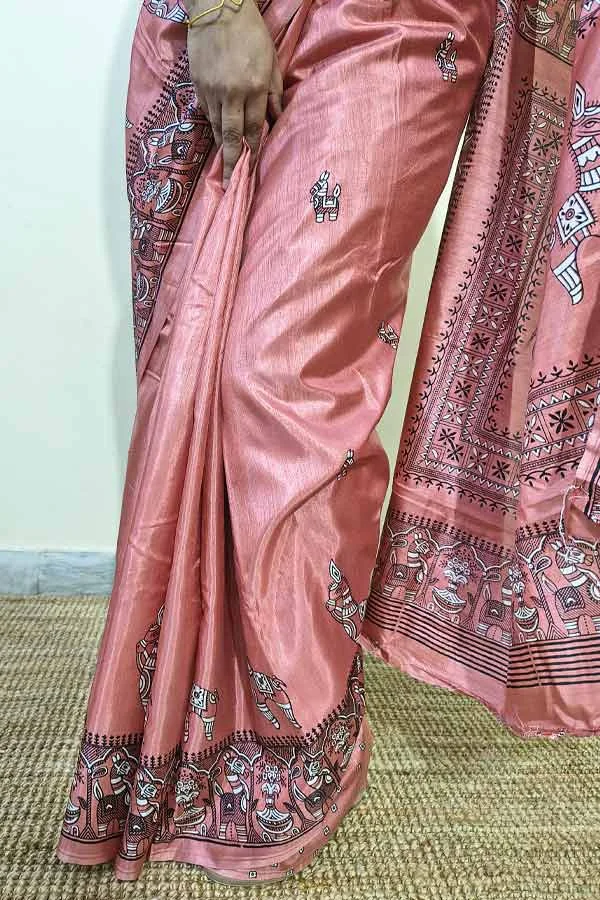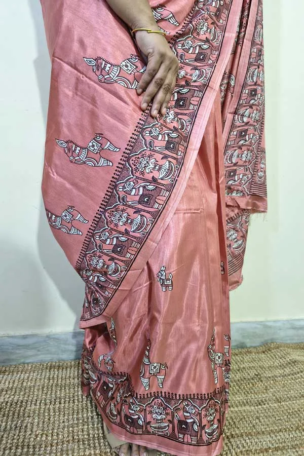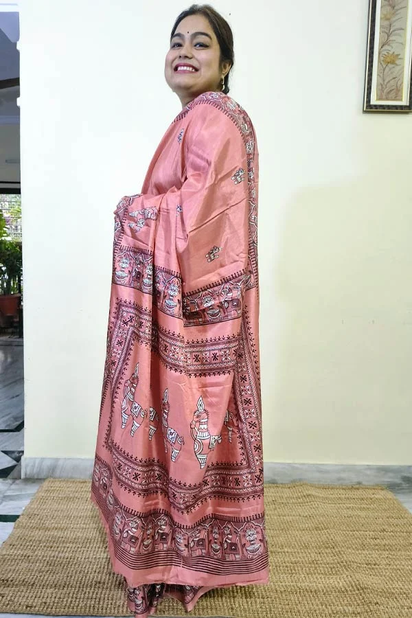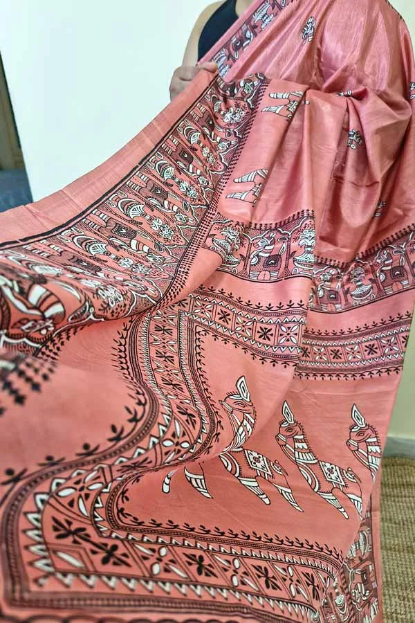 Elevate your elegance with this silk replica saree, adorned with terracotta horse prints on the entire body and the border. It is a perfect blend of tradition and contemporary style. The saree comes with a running blouse piece (last picture).