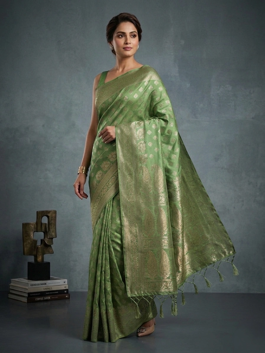 Pista Green Semi Banarasi Silk Saree in Silver Zari