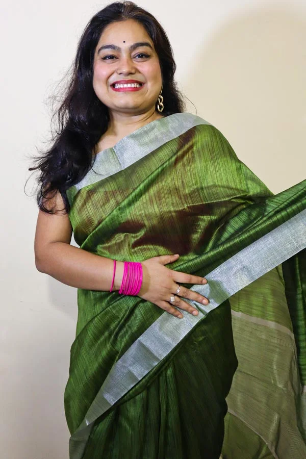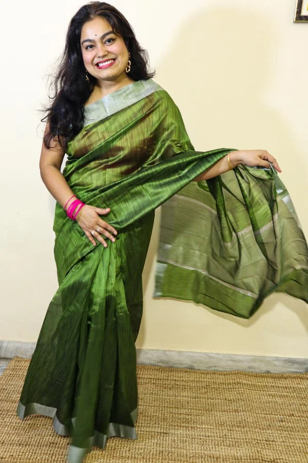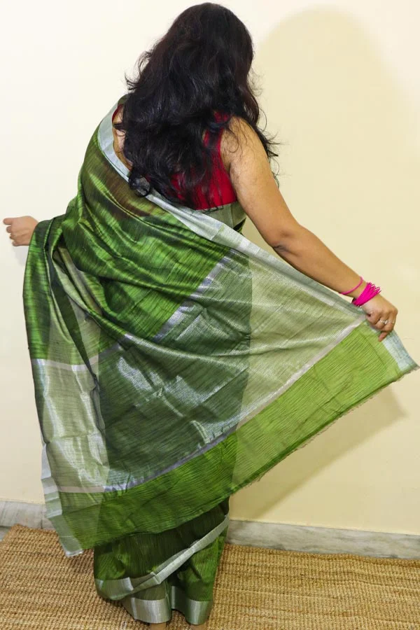 Plain Olive Green Art Silk Saree with Silver Zari Border is a plain semi-silk saree with a silver zari border. The saree has a rich and soft fabric and comes with a running blouse piece.