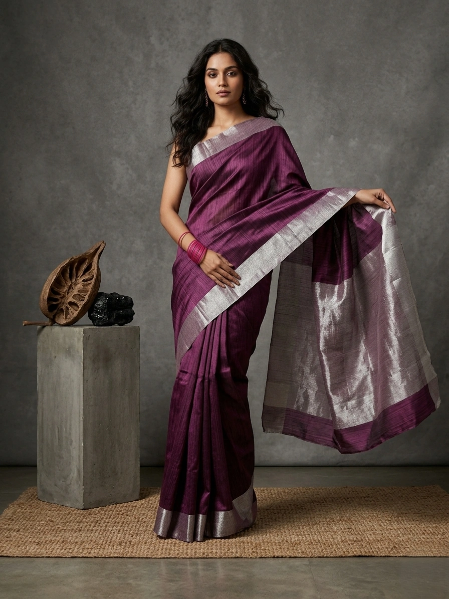 Plain Plum Art Silk Saree with Silver Zari Border is a plain semi-silk saree with a silver zari border. The saree has a rich and soft fabric and comes with a running blouse piece.
