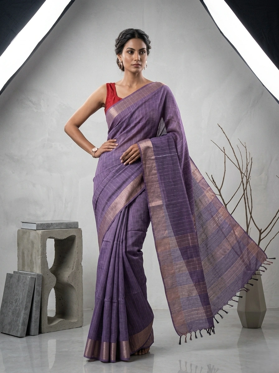 Purple Semi-Tussar Silk Saree is a plain semi-tussar silk saree with broad zari borders. The saree is made of rich fabric and comes with a running blouse piece.