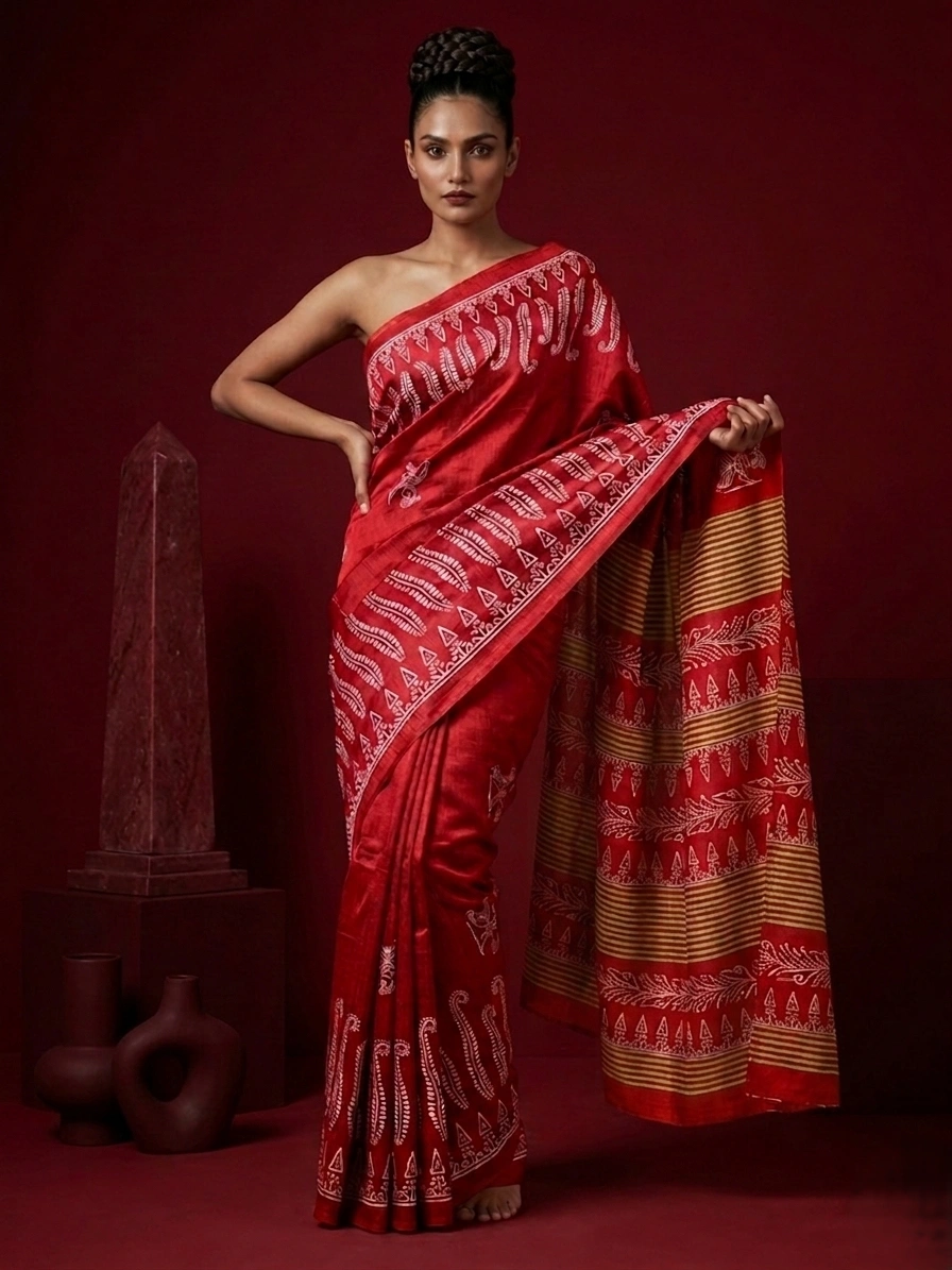 Red Semi Silk Saree with Fern Printed Border