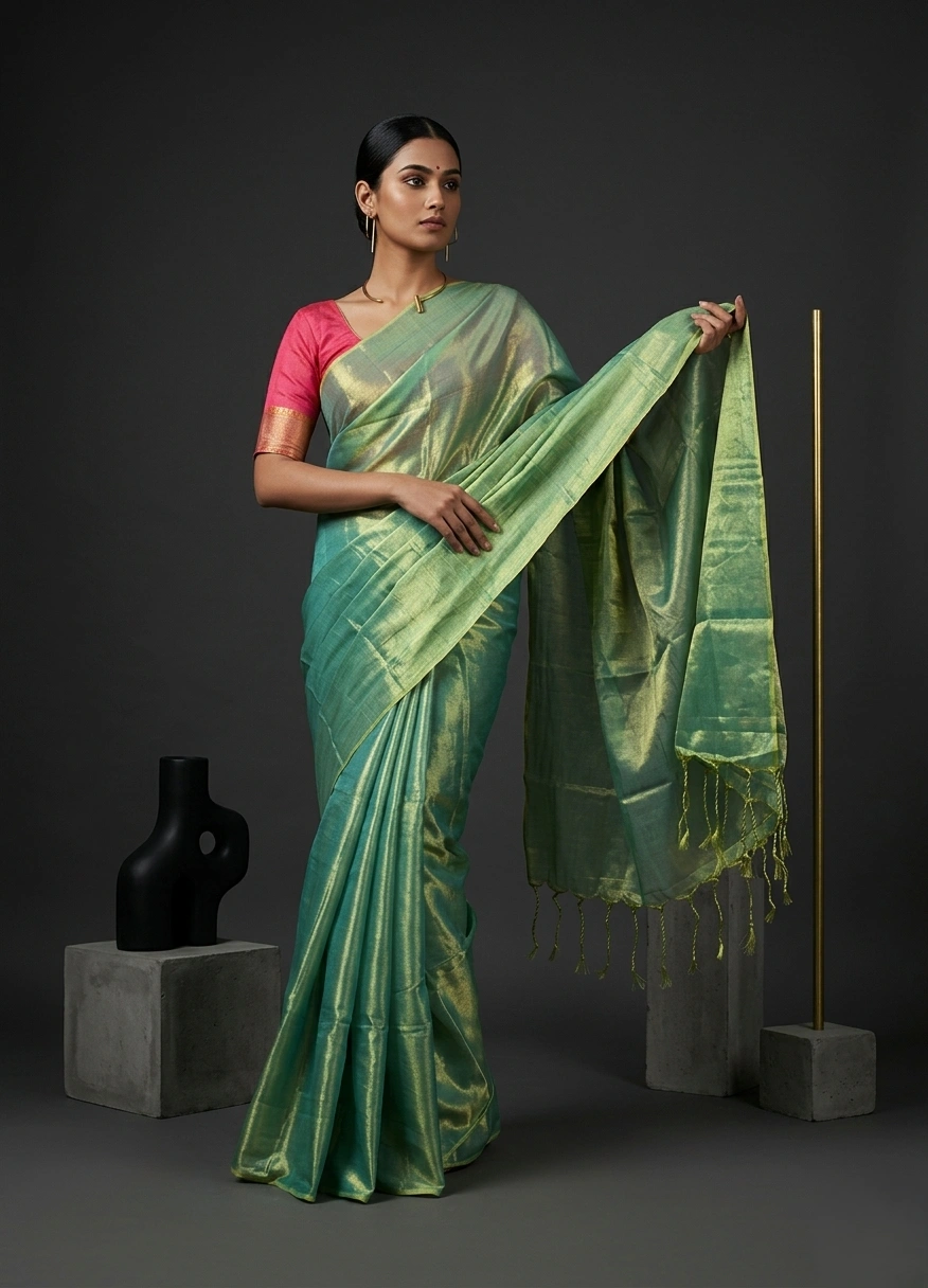 Sea Green Raaga Tissue Saree is a tissue cotton saree with a plain body with dual-toned highlights. The saree comes with a running blouse piece of the same colour.