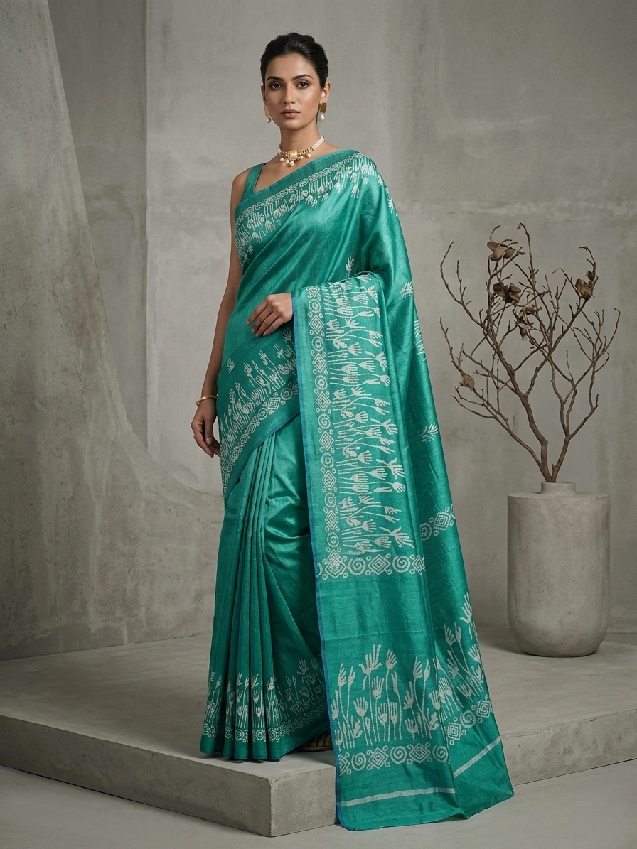 Sea Green Semi Bishnupuri Silk Saree with Floral Printed Border
