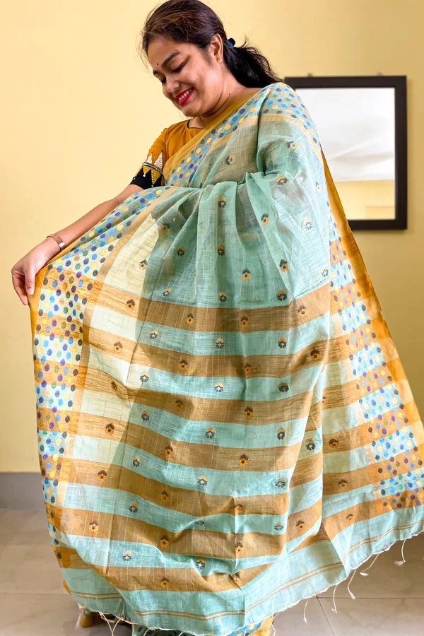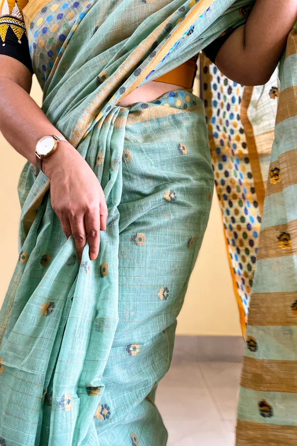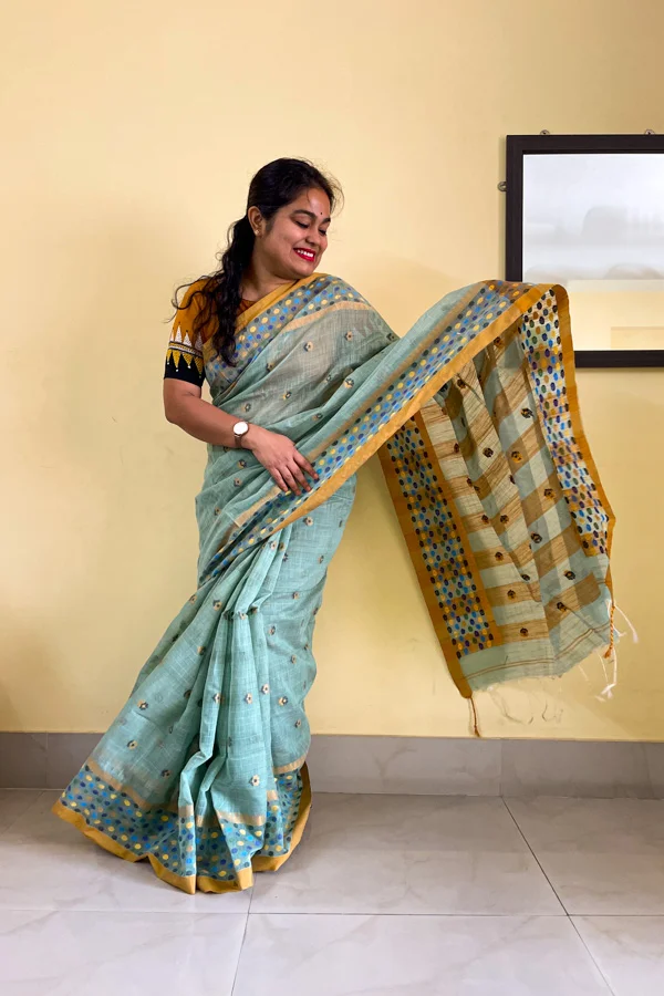 Sea Green Soft Silk Saree with Ball Motif Borders is a soft silk saree with floral thread-woven motifs all over the body in contrasting colours. The borders of the saree have multi-coloured ball-like thread-woven motifs. The saree comes with a running blouse piece.