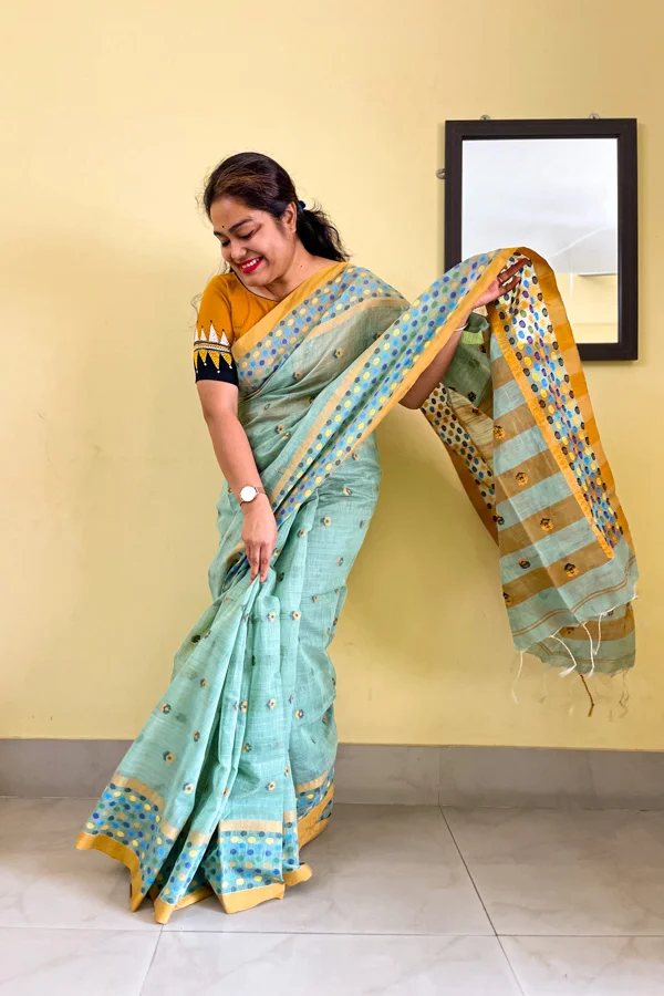 Sea Green Soft Silk Saree with Ball Motif Borders