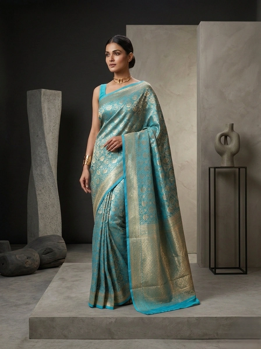 Sky Blue Semi Banarasi Silk Saree is an art silk saree with full body Banarasi zari woven work done. The saree has a rich and soft fabric and comes with a running blouse piece.