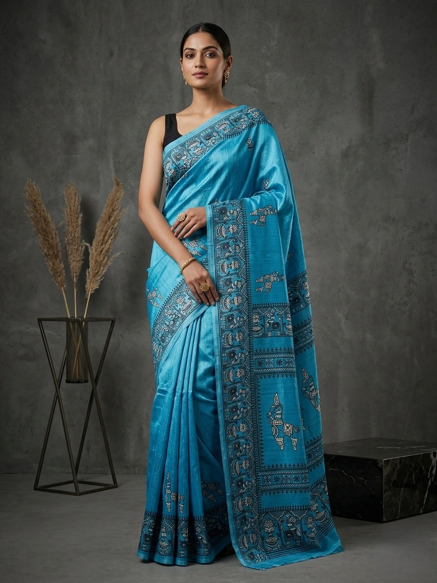 Sky Blue Terracotta Horse Printed Semi Silk Saree