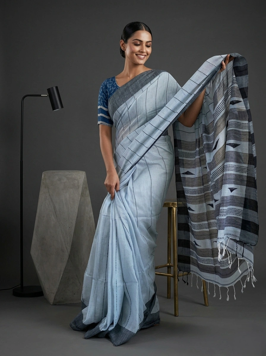 Sky Blue Thread Woven Soft Cotton Saree with Black Border is a soft cotton saree with thread-woven horizontal chains done all over the body and comes with a contrast border. The aanchal of the saree has triangle thread motifs. The saree comes with a running blouse piece.