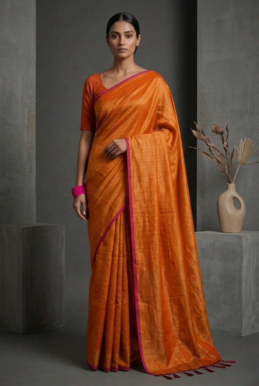 Tangerine Orange Dual Toned Tissue Plain Soft Cotton Saree