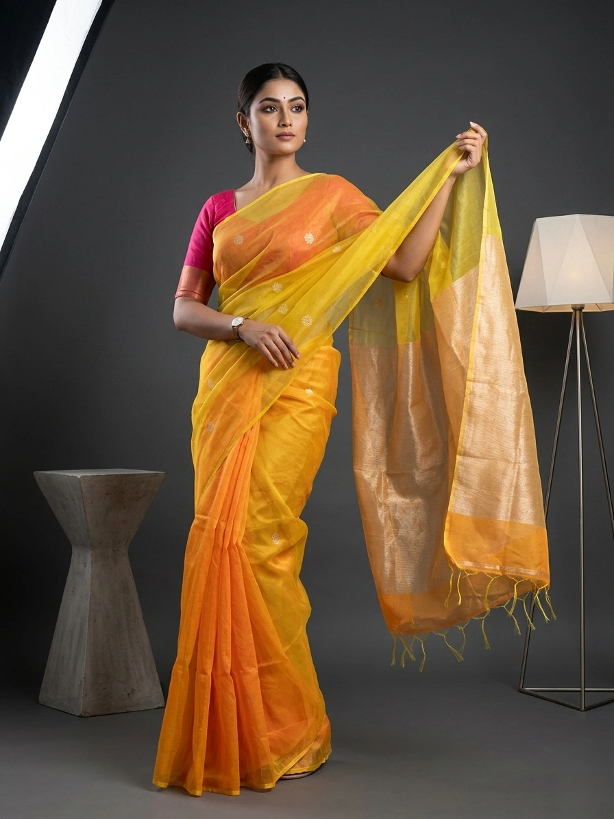Tangerine Soft Silk Saree with Yellow Muslin Drape
