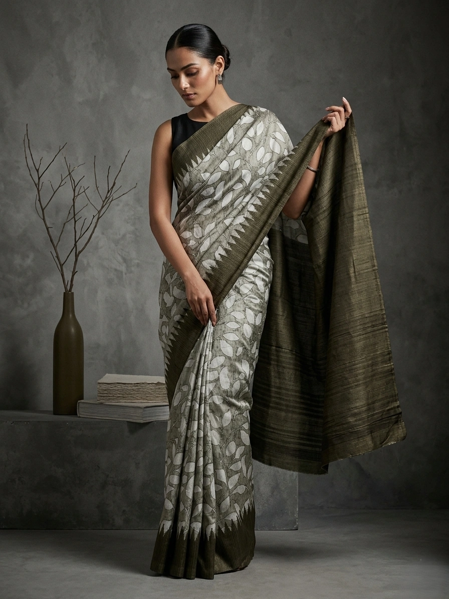 Elevate your elegance with this silk replica saree, adorned with leaf vine prints on the entire body. A beautifully contrasting temple-printed border enhances its charm, making it a perfect blend of tradition and contemporary style. The saree comes with a running blouse piece.