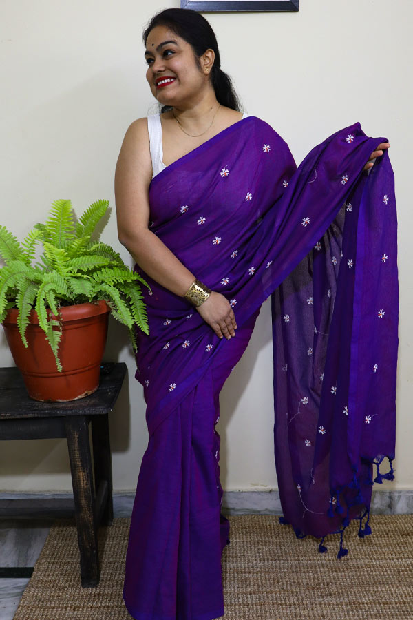 Violet Soft Cotton Saree with Parijat Motifs is a soft cotton saree with Parijat or Shiuli flowers (as called in Bengali). The saree comes in a solid colour with Parijat or Shiuli flower motifs. The saree comes with a running blouse piece. The aanchal of the saree has beautiful tasselled edges.