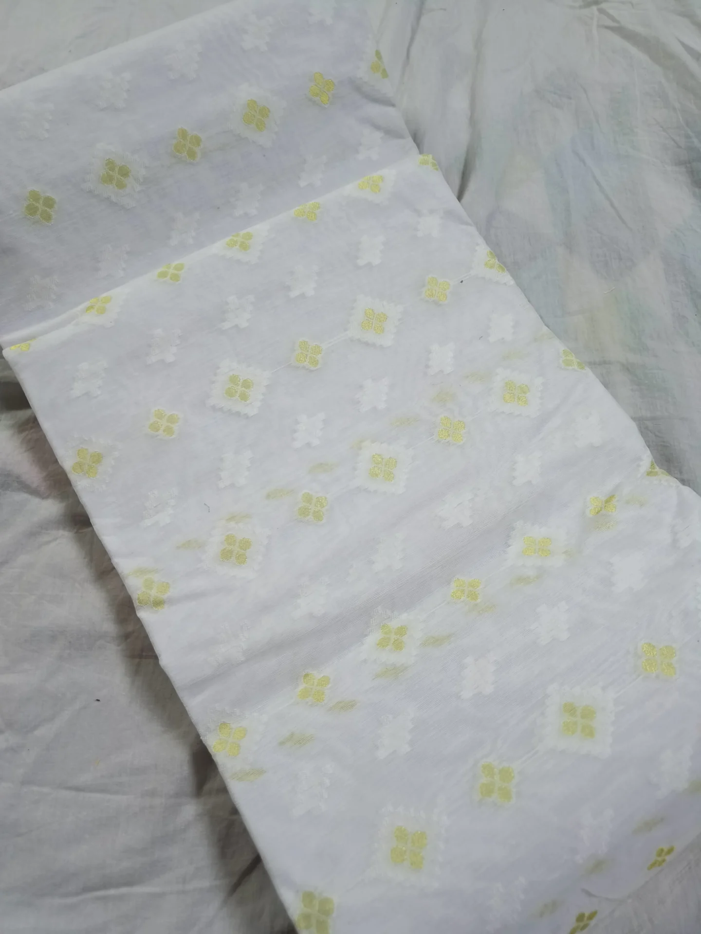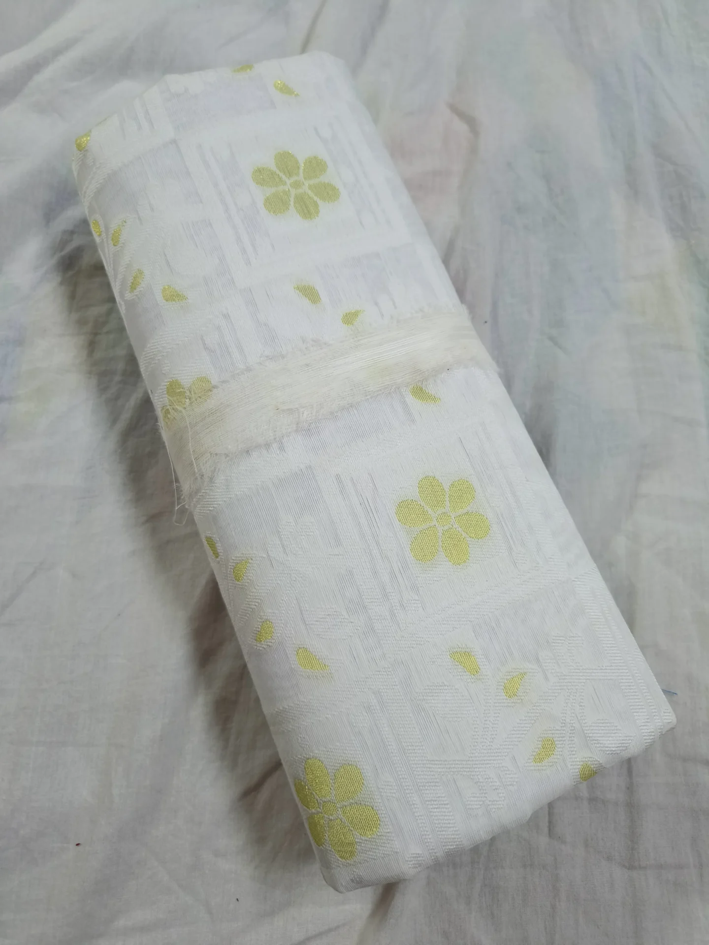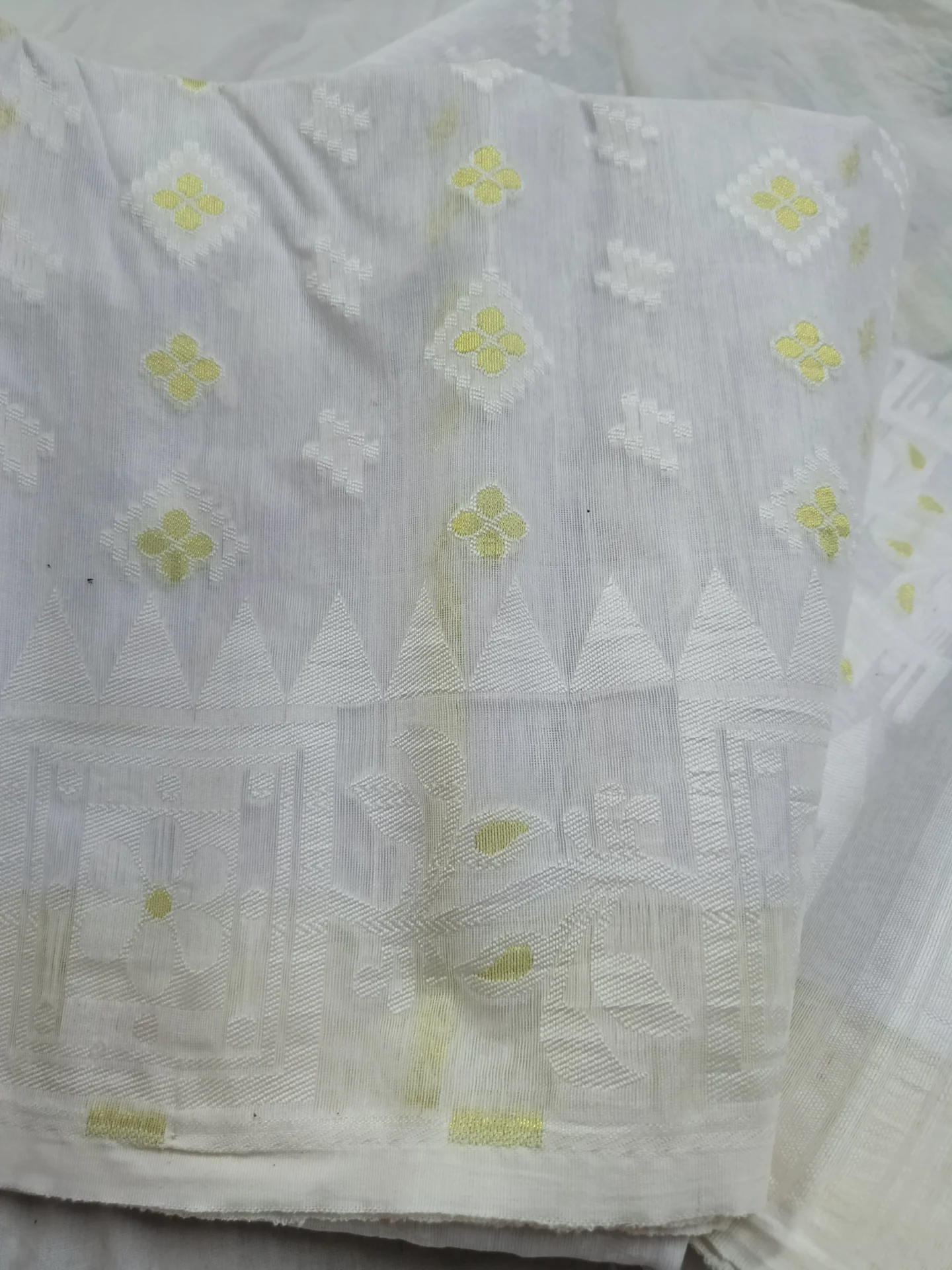 White Karat Dhakai Jamdani Saree is a Dhakai Jamdani saree with white karat Jamdani motifs with golden meenakari done over it. Jamdani sarees do not come with a blouse piece. It is a perfect fit for day festivals and work.